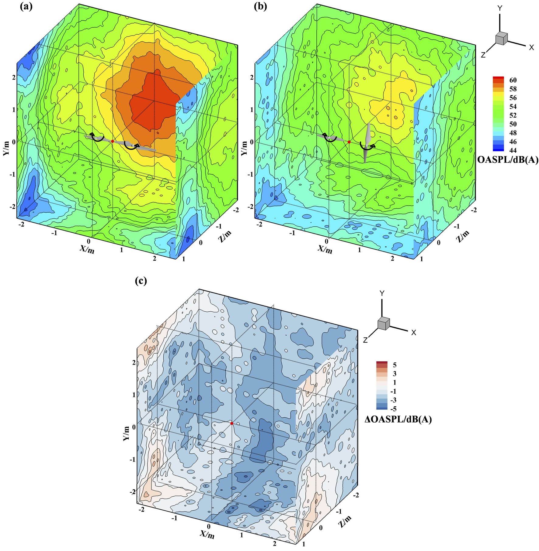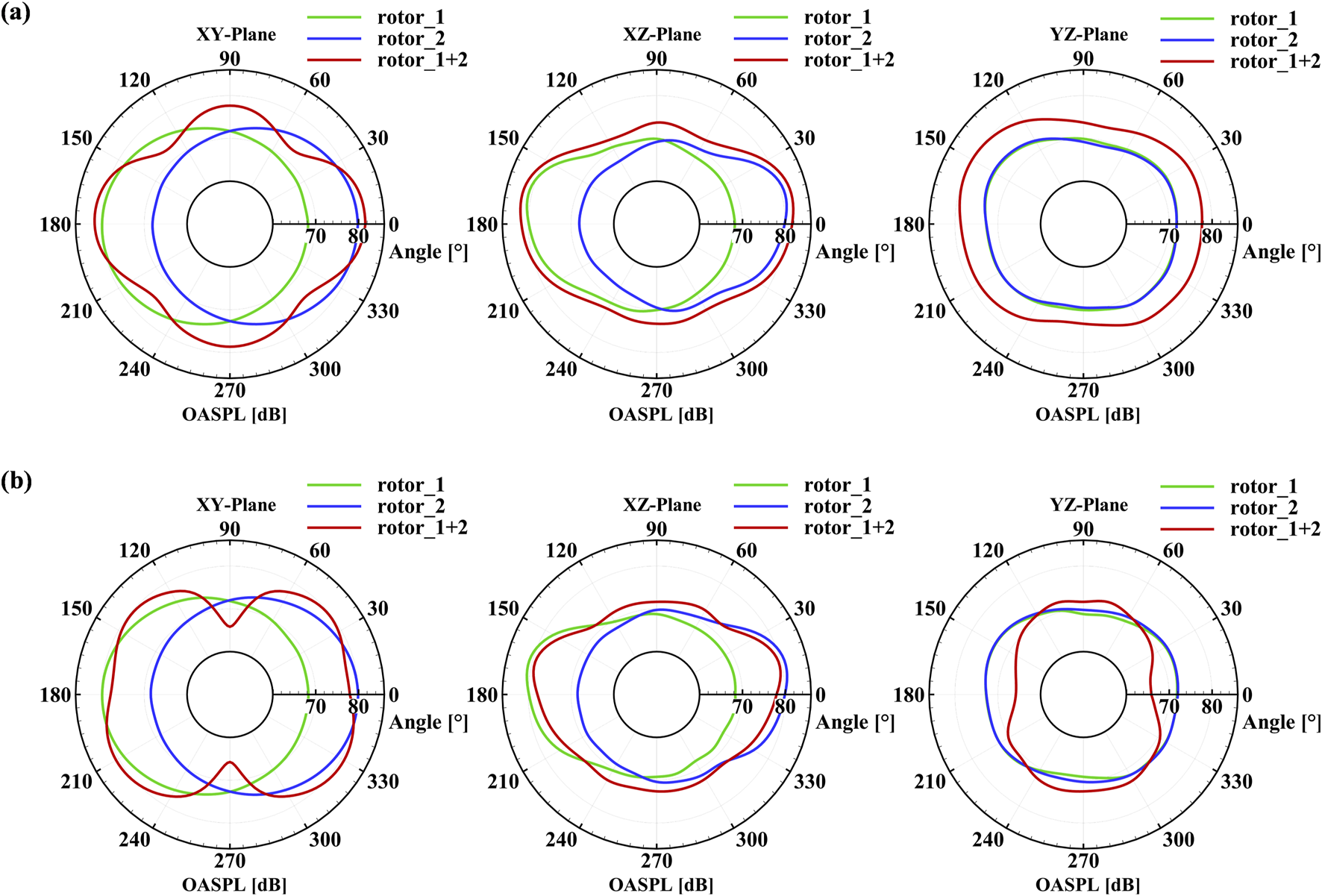The OASPL of the total noise from the dual-rotor systems are compared in Figure 14. A maximum reduction of 10 dB is seen in the XY plane at the direction of °. The reason is that the polar pattern is changed from a quadrupole shape to a dipole shape, and that the largest polars point to the horizontal directions. Additionally, the total noise in the XZ and YZ planes is also attenuated significantly when the phase difference is set.