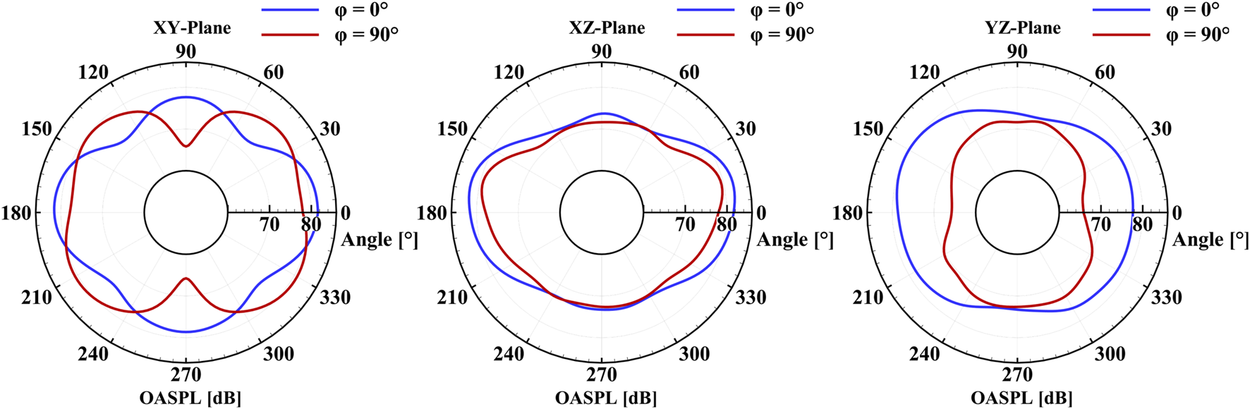 ![Polar plots of OASPL [dB] for different planes: XY-Plane, XZ-Plane, and YZ-Plane. Each plot shows two lines, blue for phi equals zero degrees and red for phi equals ninety degrees, indicating the distribution of sound levels across angles from zero to three hundred sixty degrees.](https://www.frontierspartnerships.org/files/Articles/15262/xml-images/arc-03-15262-g014.webp)