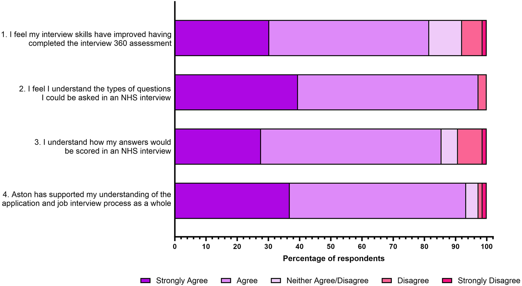 Responses to four questions regarding interview skills are shown in Figure 2 below. A total of 82% of respondents “strongly agreed or agreed” that their interview skills had improved after completing the interview 360 assessment (statement 1), with 97% of respondents reporting that they understood the types of questions that could be asked in an NHS interview (statement 2). Additionally, 86% of respondents “strongly agreed or agreed” that they understood how their answers would be scored in an NHS interview (statement 3), with 93% reporting that they felt supported by the university in understanding the application and interview process (statement 4).