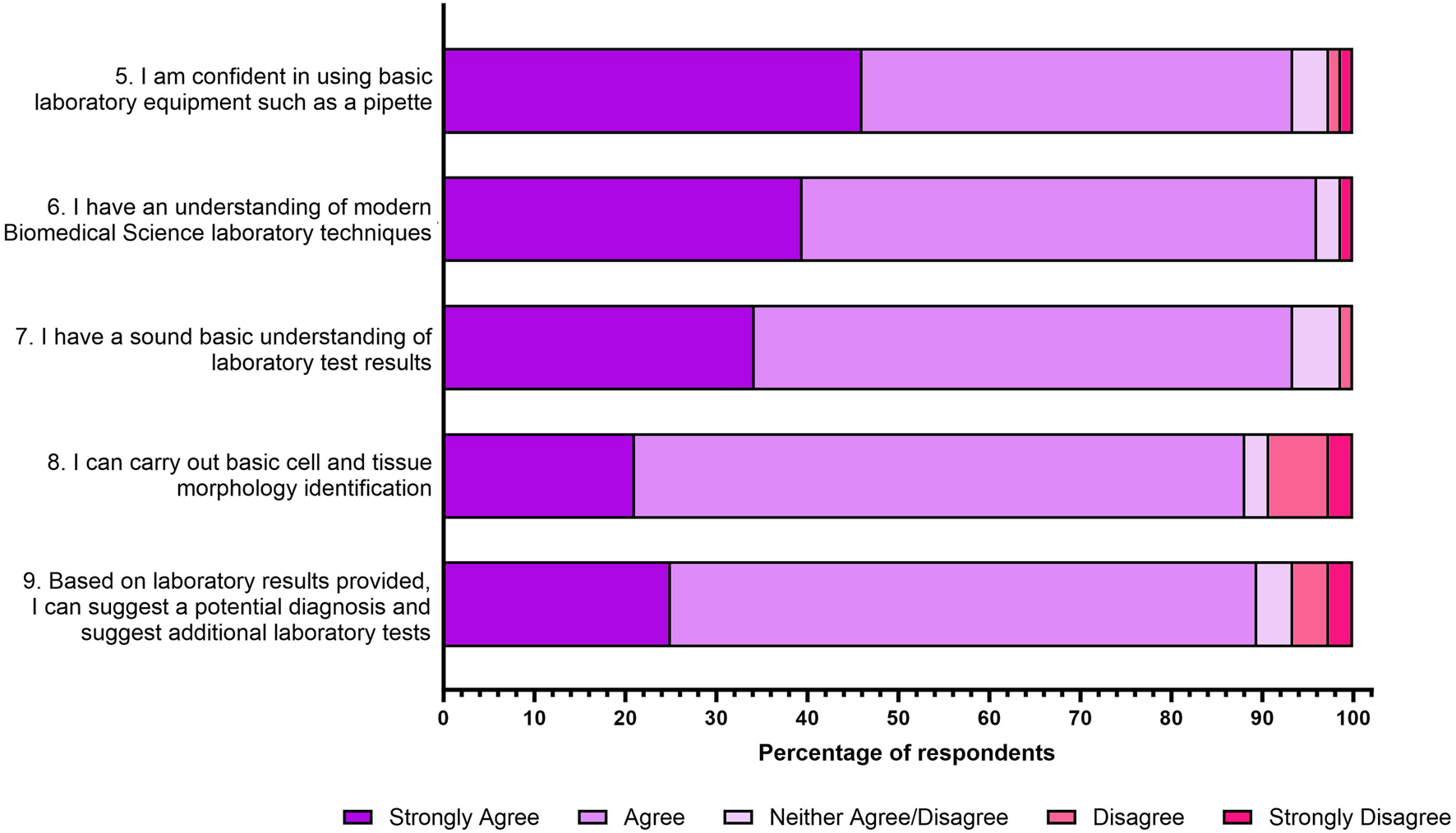 Next, participants were asked whether after completing the job interview360 assessment, they felt confident in their skills actively sought by NHS employers. As shown in Figure 3, 93% of respondents reported feeling that they were confident in using basic laboratory equipment such as a pipette (statement 5), with 96% of respondents selecting “strongly agree or agree” that they had an understanding of modern Biomedical Science laboratory techniques (statement 6). A total of 93% of respondents reported having a sound understanding of laboratory test results (statement 7), with 88% of respondents either “strongly agreeing or agreeing” that they can carry out basic cell and tissue morphology identification (statement 8). When asked whether based on test results they could suggest a potential diagnosis and recommend additional laboratory tests, 90% of respondents “strongly agreed or agreed” with this statement (statement 9).
