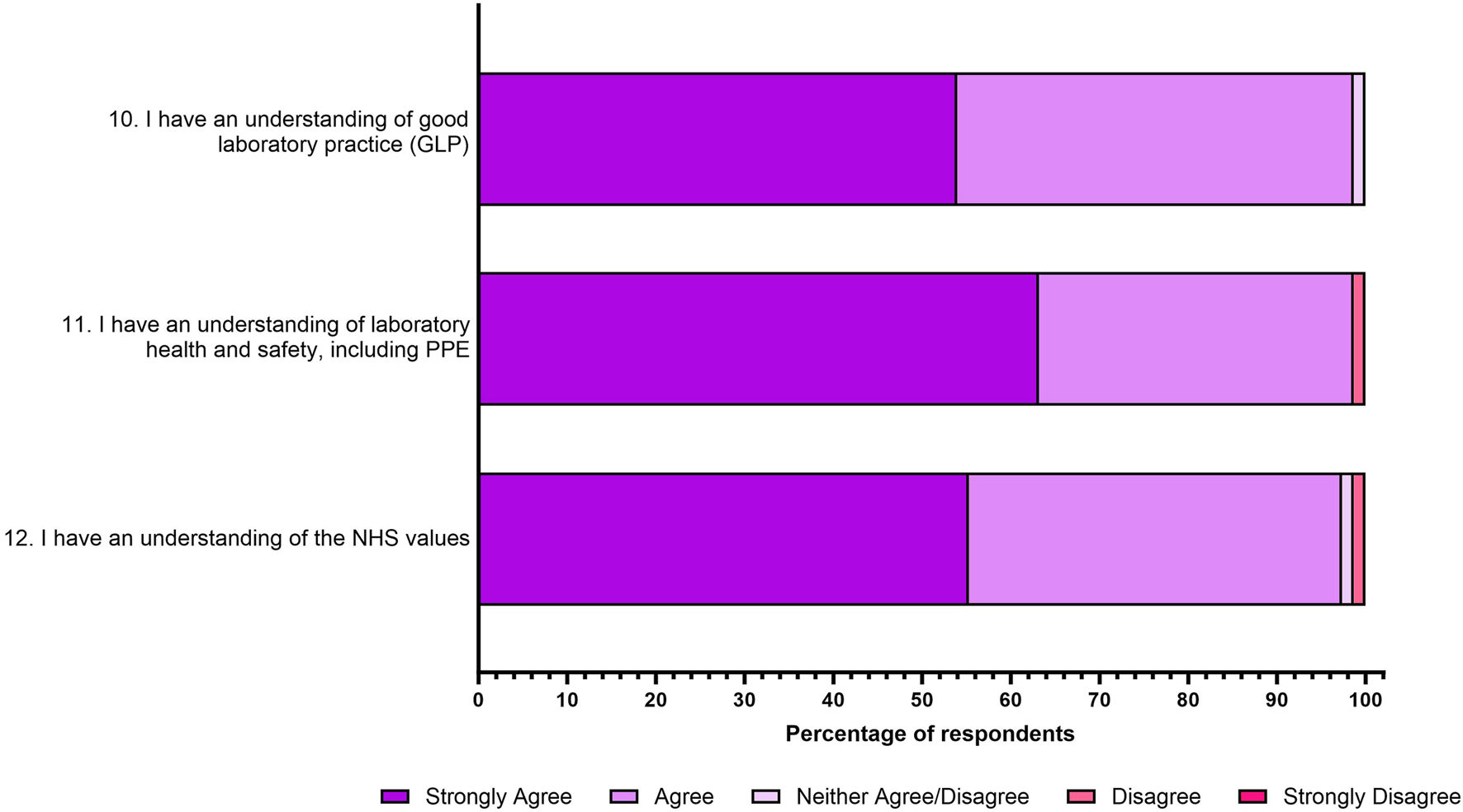 Students were then presented with three statements relating to laboratory readiness and NHS values. As shown in Figure 4, 99% of respondents “strongly agreed or agreed” that they have an understanding of good laboratory practice (statement 10), as well as laboratory health and safety (statement 11). Finally, 97% of respondents “strongly agreed or agreed” that they have an understanding of the NHS values (statement 12).