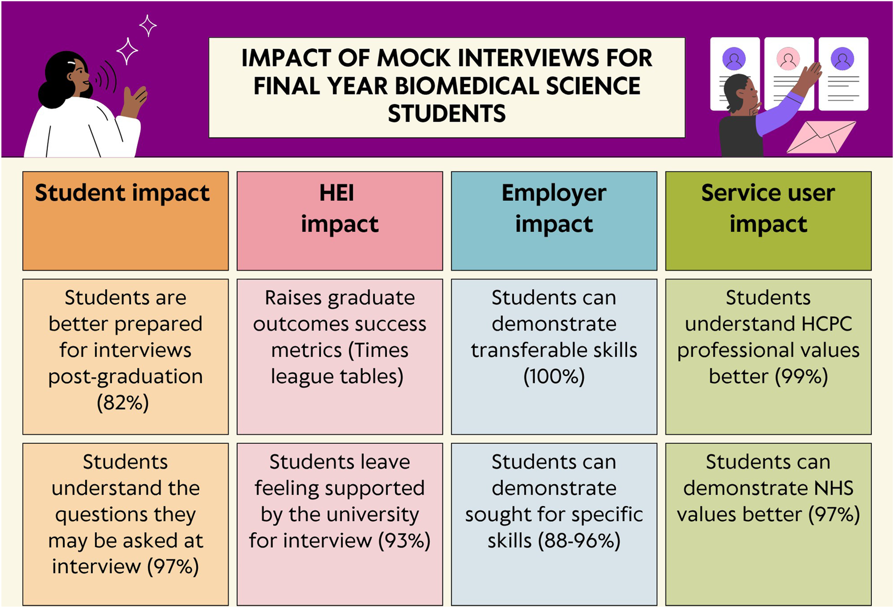 Data was collected from both the 2023-2024 and 2024-2025 final year Biomedical Science cohort. Collected data has been overwhelmingly positive, with 97% of students agreeing that they “understand the types of questions they would be asked in an NHS interview” (p < 0.0001). In terms of the key skills sought for by employers, 93% of respondents agreed or strongly agreed that they felt they could communicate within a specific situation example their understanding of “Basic equipment skills” (p < 0.0001) and their “understanding of laboratory results” (p < 0.0001). Whilst 99% of respondents agreed or strongly agreed that they could demonstrate their “understanding of laboratory health and safety” (p < 0.0001). Furthermore, respondents reported that the job interview assessment assisted them to demonstrate their transferable skills, including teamwork (81.6%) and organisational skills (71.05%).