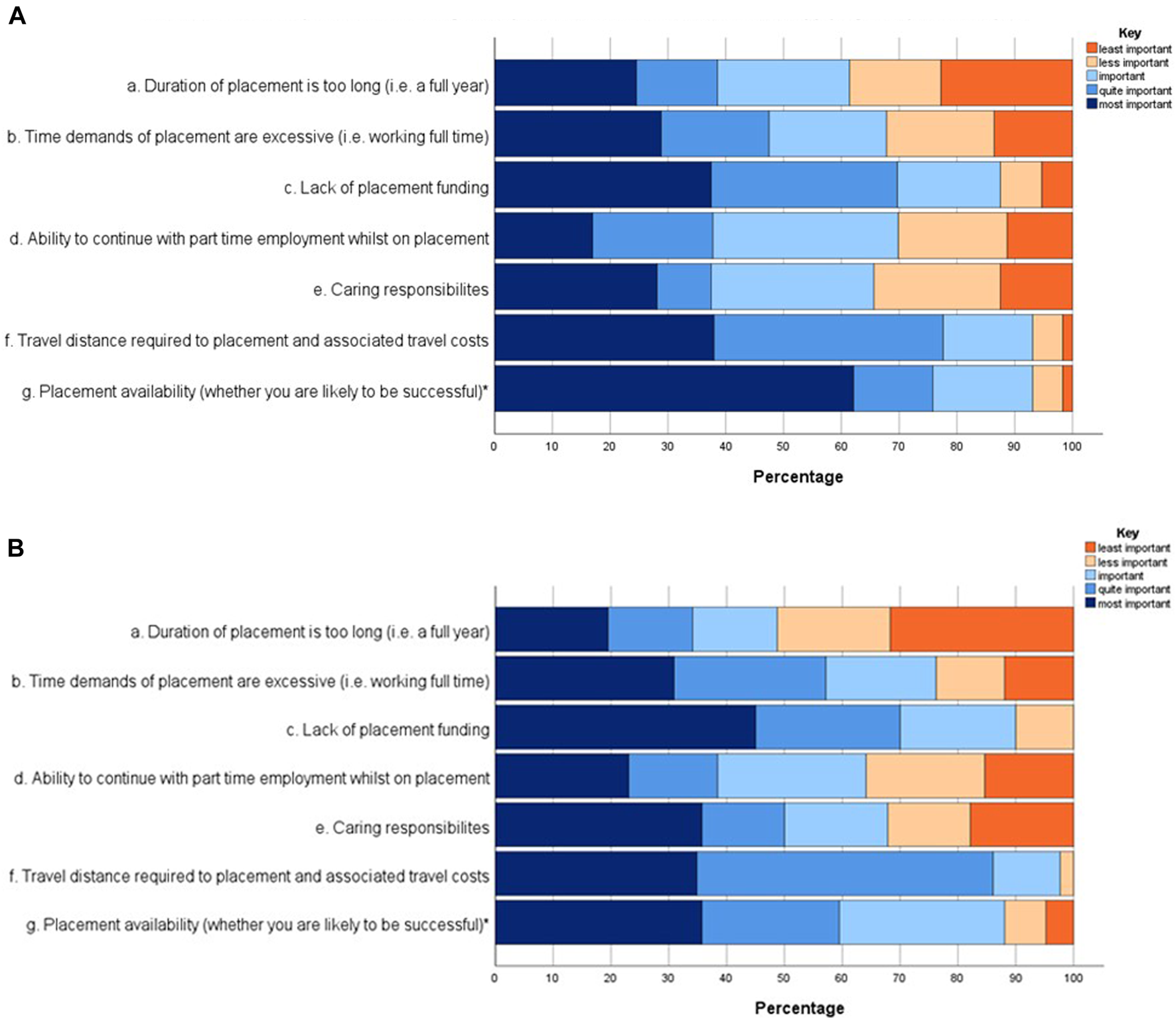 In response to statement a, which considered the placement duration, 61.4% of Level 5% and 48.7% of Level 6 participants reported this was important when choosing to apply for a placement (p = 0.306). For statement b, which considered the full-time nature of the placement year, 67.7% of Level 5% and 76.2% of Level 6 students considered this to be an important factor when deciding whether to complete a placement (p = 0.451). A key finding was statement c, that 87.5% of Level 5% and 90% of Level 6 participants felt that lack of placement funding was important when deciding whether to pursue a placement (p = 0.557). Students also considered the ability to continue with part time work in statement d, where 69.9% of Level 5 and 64.1% of Level 6 students rated this as important in their decision making (p = 0.971). In response to statement e which considered the significance of caring responsibilities, 65.6% of Level 5 and 67.9% of Level 6 students considered these to be important (p = 0.642). For statement f, which considered travel distance to placement and the cost implications of this, a significant proportion of respondents felt this was key, with 93.1% of Level 5% and 97.7% of Level 6 students rating this as important (p = 0.756). In response to statement g which considered placement availability and whether students were likely to be successful, 93.1% of Level 5 students and 88.1% of Level 6 students felt this was important (p = 0.015). A higher proportion of Level 5 students (62.1%) felt that this was the most important factor when considering whether to apply for a placement year, achieving statistical significance between the two cohorts. It is evident that placement funding and the travel distance to placement, along with the associated funding implications of this, are the most important considerations for students.