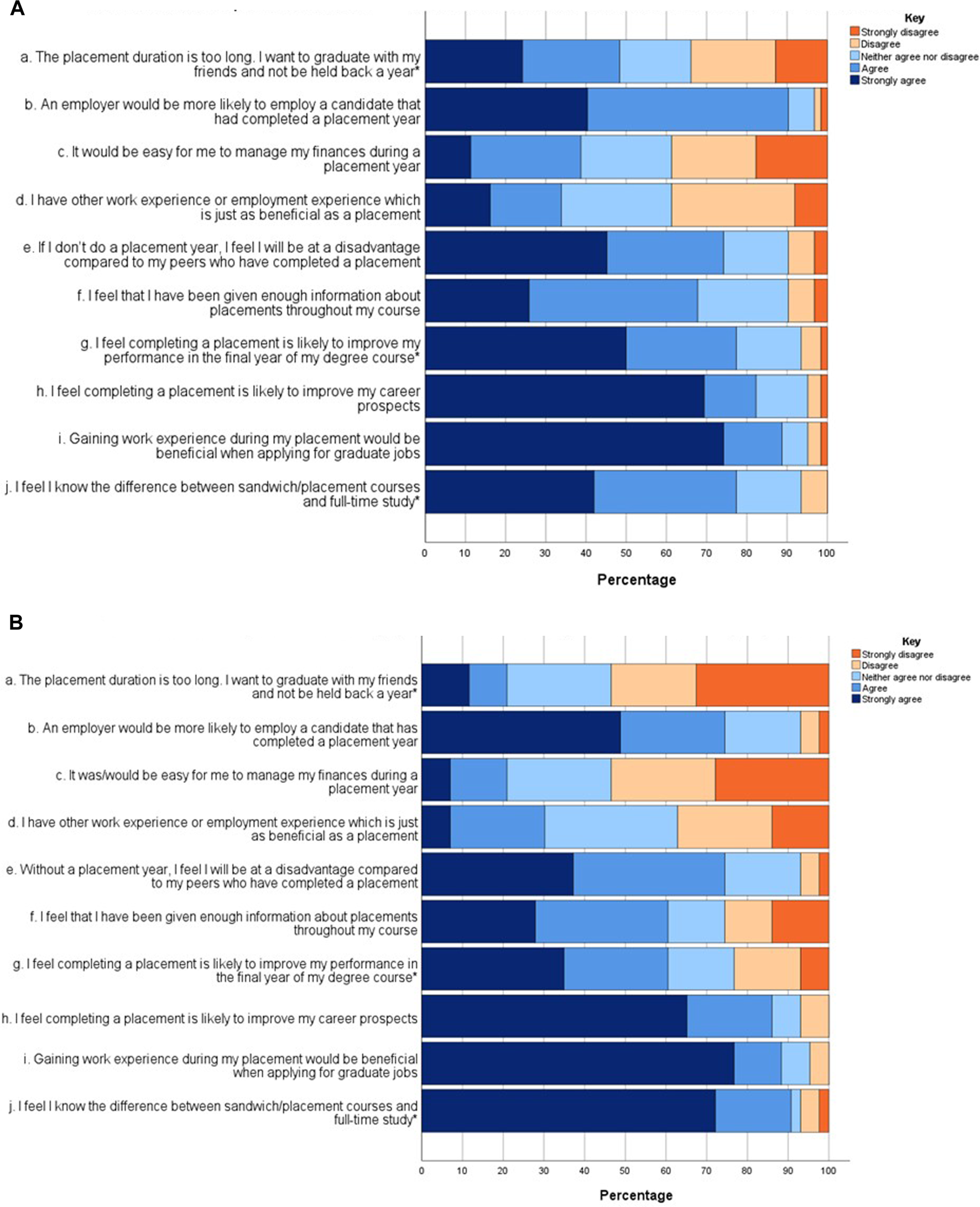Students were asked to rate several statements relating to placements and employability from strongly agree to strongly disagree, with the option to also select a neutral response. The responses are presented in Figures 2A,B.