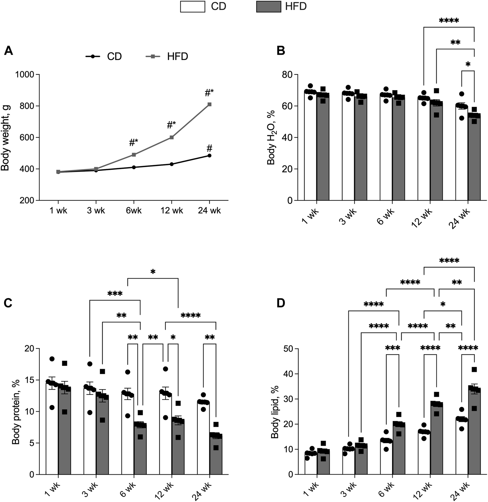 Effects of high-fat diet and age on body composition. All the parameters were measured throughout the experimental period from 1 to 24 weeks (wk). (A) Body weight; percentages of (B) body water, (C) body protein and (D) body lipid. Data are indicated as means ± SEM from n = 6 animals/group. Data were compared by two-way ANOVA considering the factor diet (CD or HFD) and age (1, 3, 6, 12, or 24 weeks) followed by Tukey’s post hoc test. *p < 0.05; **p < 0.01; ***p < 0.001; ****p < 0.0001; # significantly different compared to previous time point (p < 0.05).