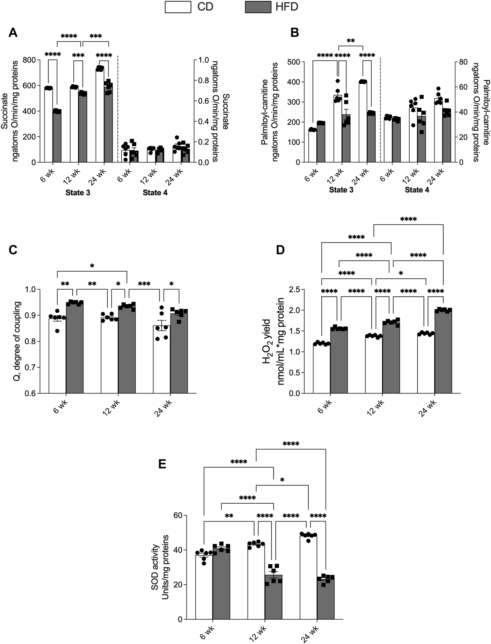 Effects of high-fat diet and age on skeletal muscle mitochondrial oxidative capacity and H2O2 release. All the parameters were measured throughout the experimental period (6–24 weeks): Mitochondrial respiration rates measured in the presence of (A) succinate or (B) palmitoyl carnitine as substrates; (C) degree of coupling (Q); (D) hydrogen peroxide yield (H2O2); (E) superoxide dismutase (SOD) activity. Data are indicated as means ± SEM from n = 6 animals/group. Data were compared by two-way ANOVA considering the factor diet (CD or HFD) and age (1, 3, 6, 12, or 24 weeks) followed by Tukey’s post hoc test. *p < 0.05; **p < 0.01; ***p < 0.001; ****p < 0.0001.