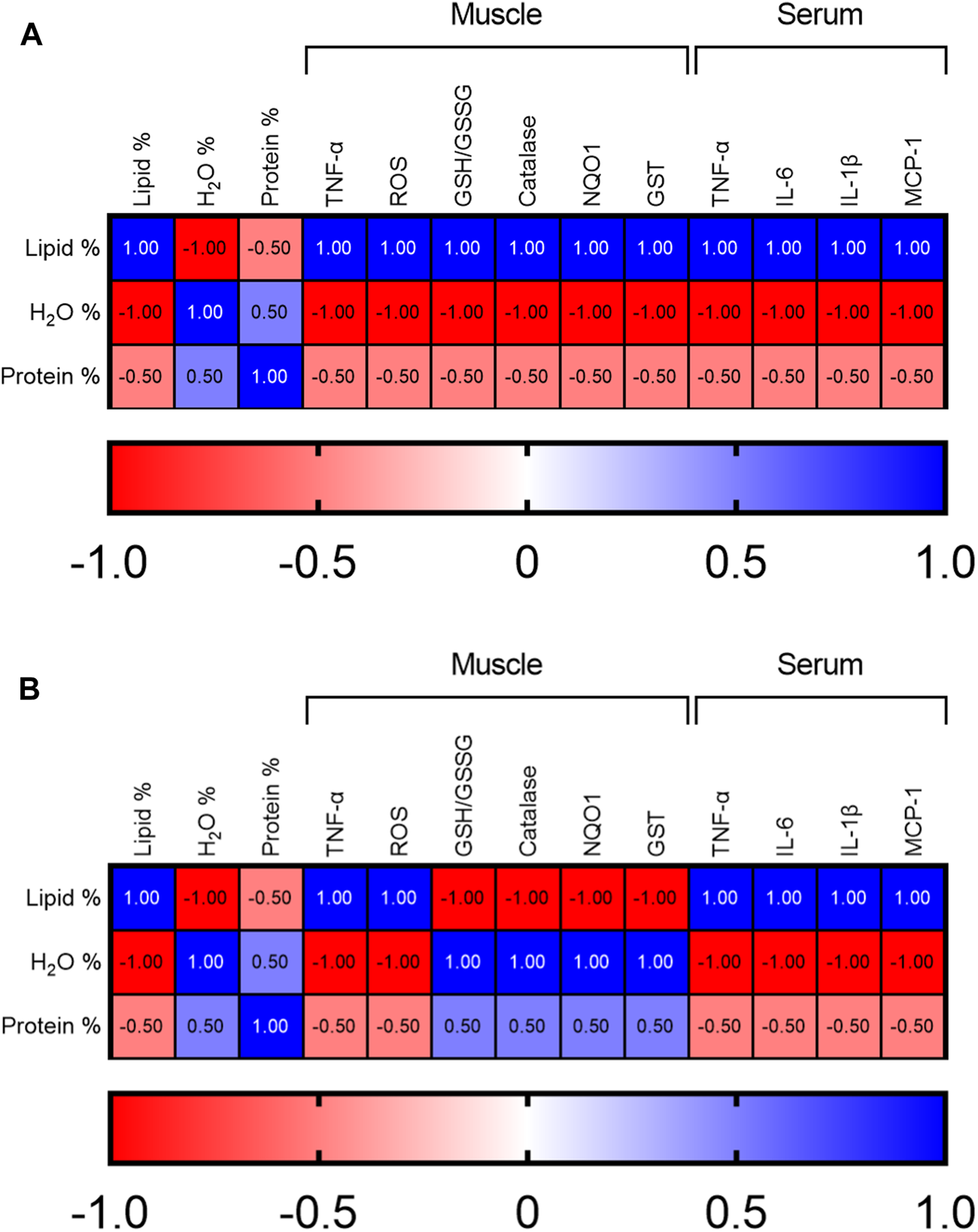 Heatmaps showing Spearman’s correlation analysis between body composition, serum/muscle pro-inflammatory parameters, and muscle antioxidant/detoxifying parameters over time considering weeks 6, 12 and 24 in (A) control and (B) high-fat diet group.