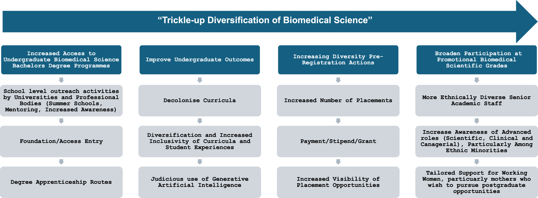 The clinical laboratory of the future will likely have more instrumentation, computation, and automation; however, the scientist will still be present. The role of the clinical laboratory scientist has shifted considerably since its origins, from a purely technical to technical specialist, advisory and clinical role [8]. AI will likely play an important role in reducing pre-analytical, analytical, and post-analytical errors and automating more processes [106]. The increasing use of AI in the workplace, including the clinical laboratory, can offer the opportunity to enhance productivity with more focus on consequential tasks [107]. A meaningful embrace of AI in the clinical laboratory may actually play a role in increasing the number of scientists, especially those conducting high level and consequence activities, as demonstrated in other industries [108]. The UK and to a lesser extent, the US, have embraced advanced roles of laboratory scientists to “Consultant” level in the UK and “Laboratory Director” in the US, although less than 10% of Laboratory Directory roles are occupied by non-physicians [109]. A more diverse, well-educated clinical scientific workforce is essential to meet future demands of the profession, to respond and implement new technologies, advanced testing algorithms and personalised medicine to ensure patient safety. The demands on healthcare systems are continuing to grow; marked by an ageing population with multiple co-morbidities and increased case complexity [110], The most sustainable and promising way to ensure this is through recognising the current barriers that are present at undergraduate level, pre-registration, and post-registration barriers to progression The key findings of this review have been summarised in Figure 2, demonstrating a sustainable, step wise, “trickle-up” approach to diversifying biomedical sciences at each of the primary hurdles. Although the core foci of this review have been improving participation by ethnic minorities and those from disadvantaged backgrounds, these steps can be tailored and applied to improve diversity among other minoritised cohorts also.