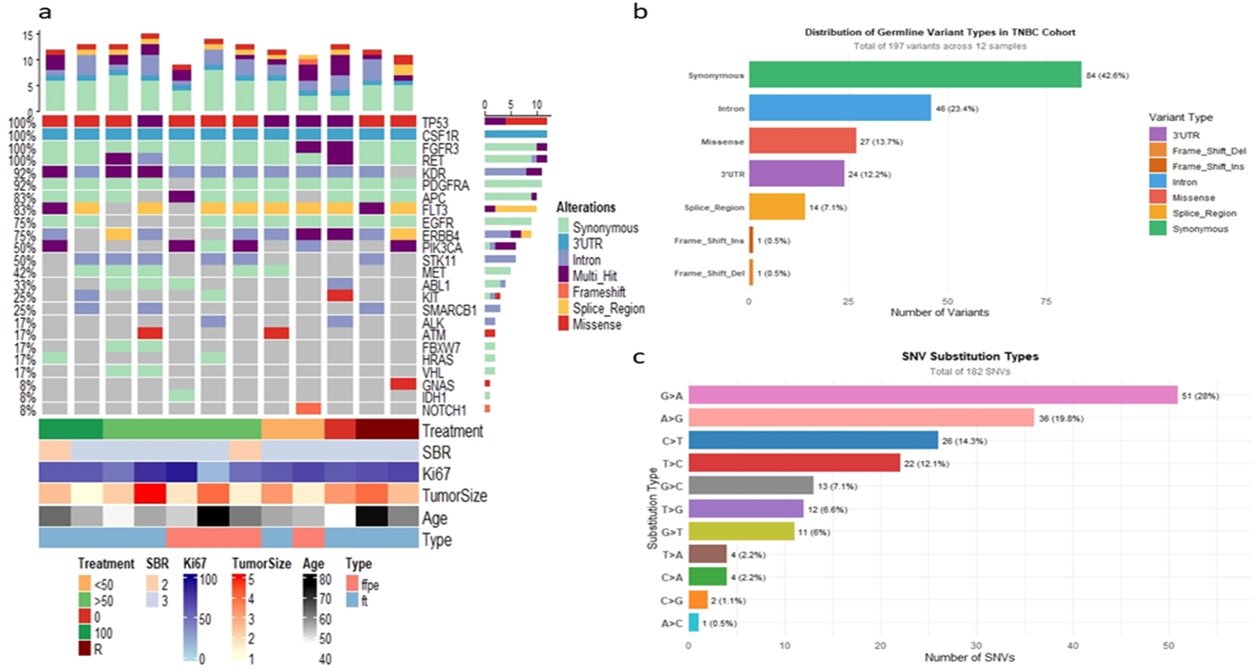 Germline variant analysis across the twelve TNBC patients revealed a diverse set of inherited alterations, predominantly classified as benign or likely benign according to ClinVar, yet reflecting a broad genomic variability within the cohort (Table 2). The most frequently mutated gene was TP53 p.Pro72Arg (rs1042522) variant, detected in all patients (100%). Other genes with high mutation prevalence included CSF1R (rs2066933), FGFR3 (rs7688609), RET (rs1800861), KDR (rs7692791), and PDGFRA (rs1873778), each altered in over 80% of the cohort. Additional recurrently affected genes included APC (rs41115), FLT3 (rs2491231), EGFR (rs1050171), ERBB4 (rs839541), and PIK3CA (rs3729674), showing mutation frequencies ranging from 50% to 75%. Less frequently mutated genes, such as MET, ABL1, KIT, SMARCB1, ALK, ATM, FBXW7, VHL, HRAS, GNAS, IDH1, and NOTCH1, were identified in 8%–33% of patients (Figure 1a).