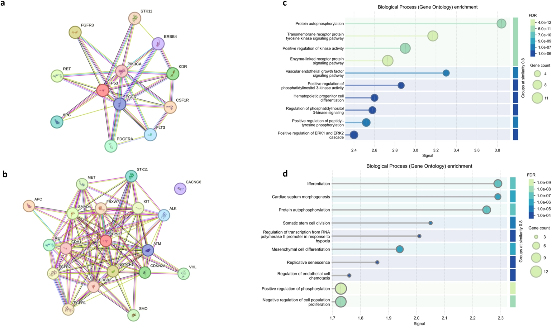 We constructed a protein-protein interaction (PPI) network to elucidate potential functional interactions among the mutated genes identified in our TNBC cohort. The network was generated using the STRING database (version 12.0) by inputting the respective gene symbols and executing the analysis with all default settings. Subsequently, the network was partitioned into clusters using the Markov Cluster Algorithm (MCL), applying the default inflation parameter of 3 to define protein complexes and functional modules. Finally, each cluster was annotated for biological pathway involvement via the built-in STRING enrichment analysis tool, with a focus on Gene Ontology (GO) pathways.