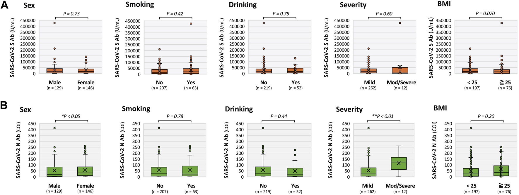 Figure 1 also shows comparisons of SARS-CoV-2 S- and N-antibody titers according to sex, smoking status, alcohol consumption, severity of acute COVID-19 (mild vs. moderate to severe), and BMI (<25 vs. ≥25 kg/m2). For S-antibody titers (Figure 1A), no significant differences were observed according to smoking status [non-smokers: median = 15,487 (interquartile range, IQR: 4,222–39,237) vs. smokers: median = 18,779 (4,966–46,934), P = 0.42), alcohol consumption (non-drinkers: median = 15,594 (IQR: 4,389–38,954) vs. drinkers: median = 16,908 (5,281–45,136), P = 0.75], severity of acute COVID-19 [mild: median = 15,768 (IQR: 4,926–39,359) vs. moderate to severe: median = 5,066 (552–54,969), P = 0.60], or BMI [<25 kg/m2: median = 16,253 (IQR: 6,211–41,060) vs. ≥25: median = 13,693 (125–34,521), P = 0.070]. For N-antibody titers (Figure 1B), no significant differences were observed according to smoking status [non-smokers: median = 29.5 (IQR: 5.9–81.8) vs. smokers: median = 23.8 (6.9–92.3), P = 0.78], alcohol consumption [non-drinkers: median = 29.5 (IQR: 6.9–84.8) vs. drinkers: median = 22.5 (3.7425–79.325), P = 0.44], or BMI [<25 kg/m2: median = 24.6 (IQR, 4.975–73.3) vs. ≥25: median = 36.6 (9.0–96.0), P = 0.20]. In contrast, N-antibody titers were significantly higher in patients with moderate to severe acute COVID-19 than those in patients with mild disease [median = 124.5 (IQR: 44.6–166.0) vs. 25.1 (5.9–77.6), **P < 0.01].