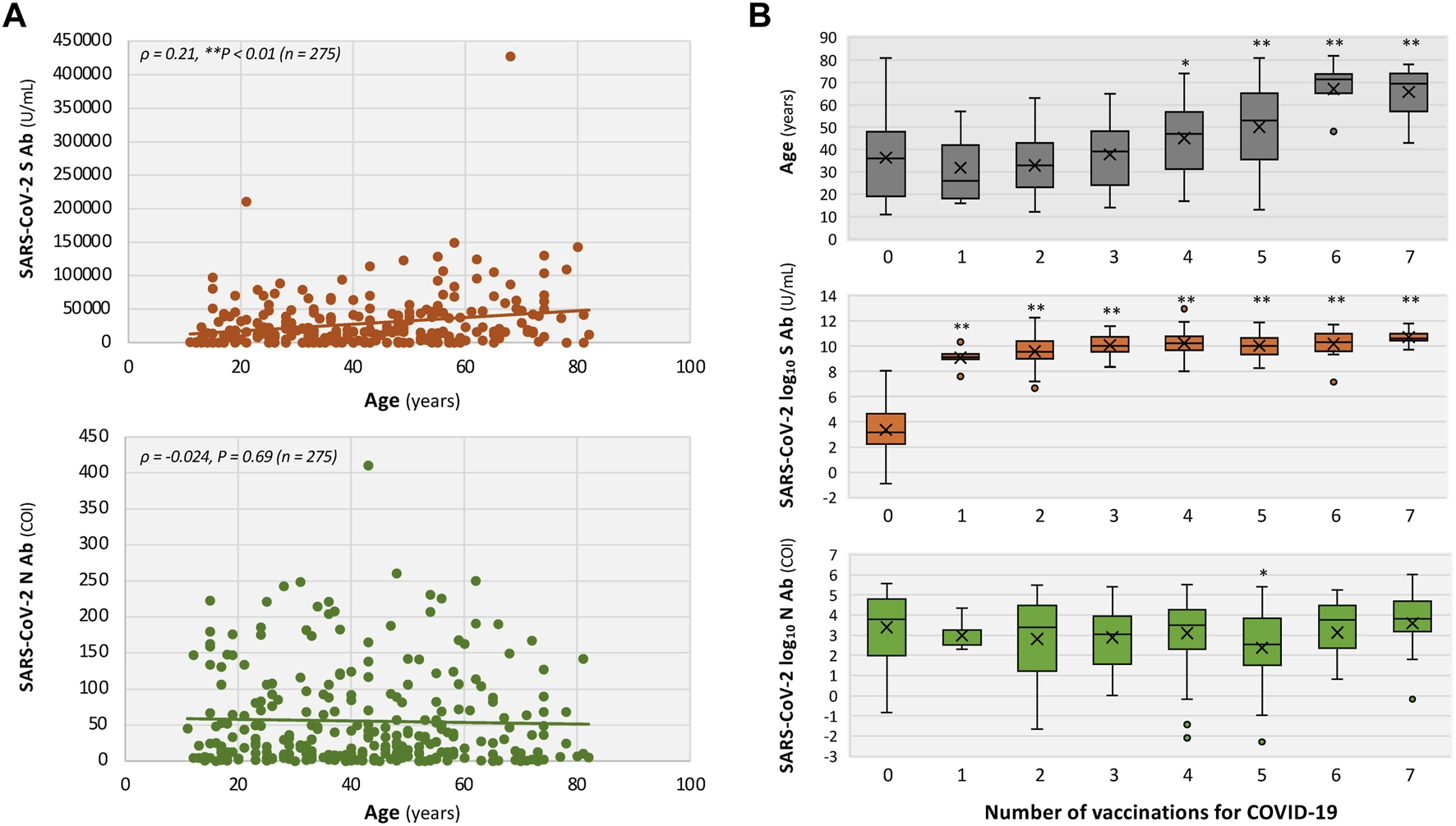 As shown in Table 2, 57 (21%) of the 275 patients with long COVID were unvaccinated. The median S-antibody titers were significantly higher in the vaccinated patients than those in patients without vaccination (vaccinated vs. unvaccinated patients: 20,963 vs. 24 U/mL, **P < 0.01). Median N-antibody titer was 24.8 COI in the vaccinated patients and 44.5 COI in the unvaccinated patients, which were not significantly different (P = 0.072; Table 2). As shown in Figure 2A, serum S-antibody titers, but not N-antibody titers, were positively correlated with patients’ age (Spearman’s ρ = 0.21; **P < 0.01). Moreover, as shown in Figure 2B, patient age increased with the number of COVID-19 vaccine doses received. Median age was 36 years in the unvaccinated patients (n = 57), 26 years after one dose (n = 5), 33 years after two doses (n = 47), 39 years after three doses (n = 60), 47 years after four doses (n = 54), 53 years after five doses (n = 28), 71.5 years after six doses (n = 14), and 69.5 years after seven doses (n = 10). Patients who received four (*P < 0.05) or more (**P < 0.01) vaccine doses were significantly older than the unvaccinated patients (Figure 2B, upper).