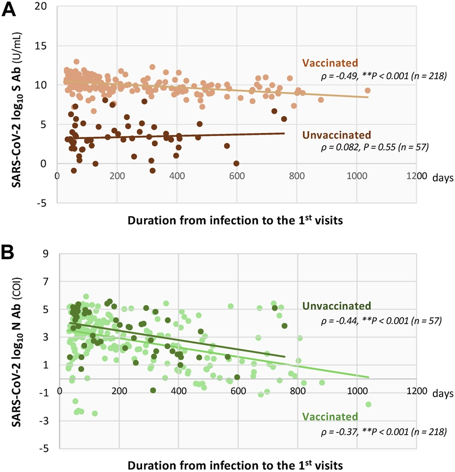 Serum antibodies were assessed by each physician to evaluate past infection conditions and/or the possibility of vaccination. Serum samples obtained at initial visits were used for measurement of anti-SARS-CoV-2 spike (S)-protein (RBD) and anti-SARS-CoV-2 nucleocapsid (N)-protein using the Elecsys Anti-SARS-CoV-2 S RUO and Anti-SARS-CoV-2 RUO electrochemiluminescence (ECLIA) kits (Roche Diagnostics, Rotkreuz, Switzerland), respectively, under the operation with Cobas 8000 modular analyzer system at the Central Laboratory of Okayama University Hospital. For the analysis of Anti-SARS-CoV-2 S RUO, the measurement range is 0.40–25,000 U/mL (with 1:100 dilution) with a concentration of <0.80 U/mL considered negative. Threshold of the antibody titer was set to 200 U/mL to stratify patients based on a past report [26, 27]. For the analysis of Anti-SARS-CoV-2 RUO, the COI is 1.0, and values <1.0 indicate negative and ≥1.0 are considered positive. Antibody decay over time was evaluated using linear regression models with log-transformed antibody levels as the dependent variable and time from symptom onset to first visit as the independent variable. An exponential decay in antibody levels was assumed.