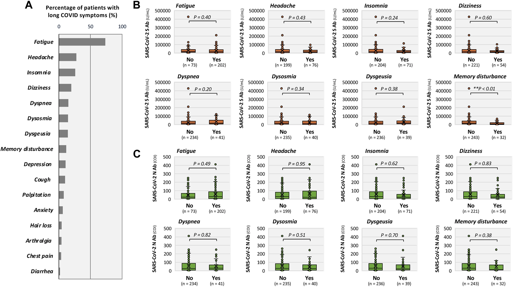 The percentage of patients with long COVID symptoms at presentation is shown in Figure 4A. Fatigue was the most common symptom reported by 73.5% of the patients, followed by headache (27.6%) and insomnia (25.8%). Among long COVID symptoms, S-antibody titers were significantly lower in patients with memory disturbance than those in patients without memory disturbance (median [IQR]: 6117 [25.0–23656] vs. 16029 [5974–41136] U/mL; **P < 0.01; Figure 4B). No significant differences in S-antibody titers were observed for other symptoms characterized by long COVID. Regarding N-antibody titers, there were no significant differences between patients with and without prolonged COVID symptoms (Figure 4C).