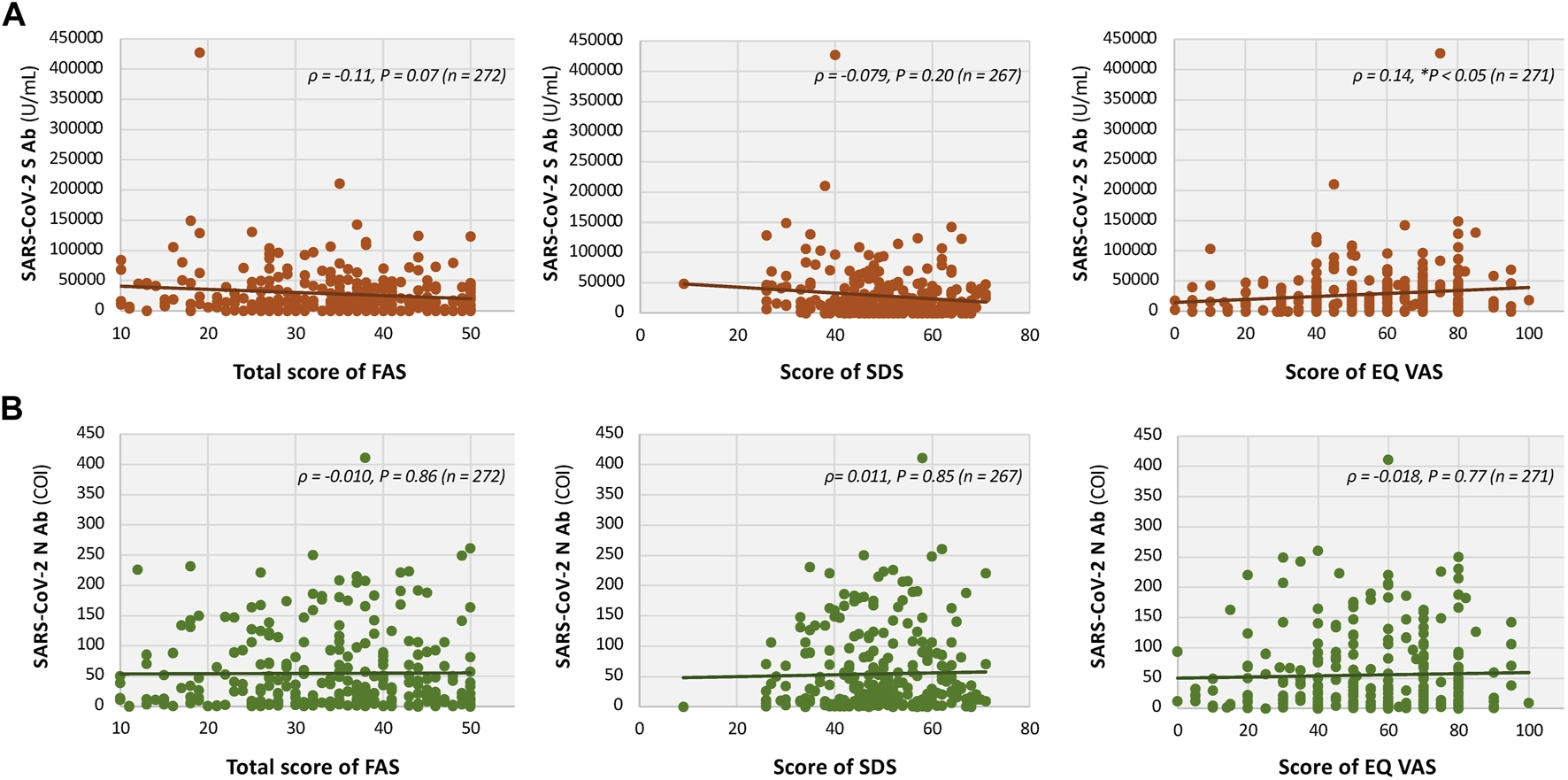 Serum titers of SARS-CoV-2 antibodies in patients with long COVID.
