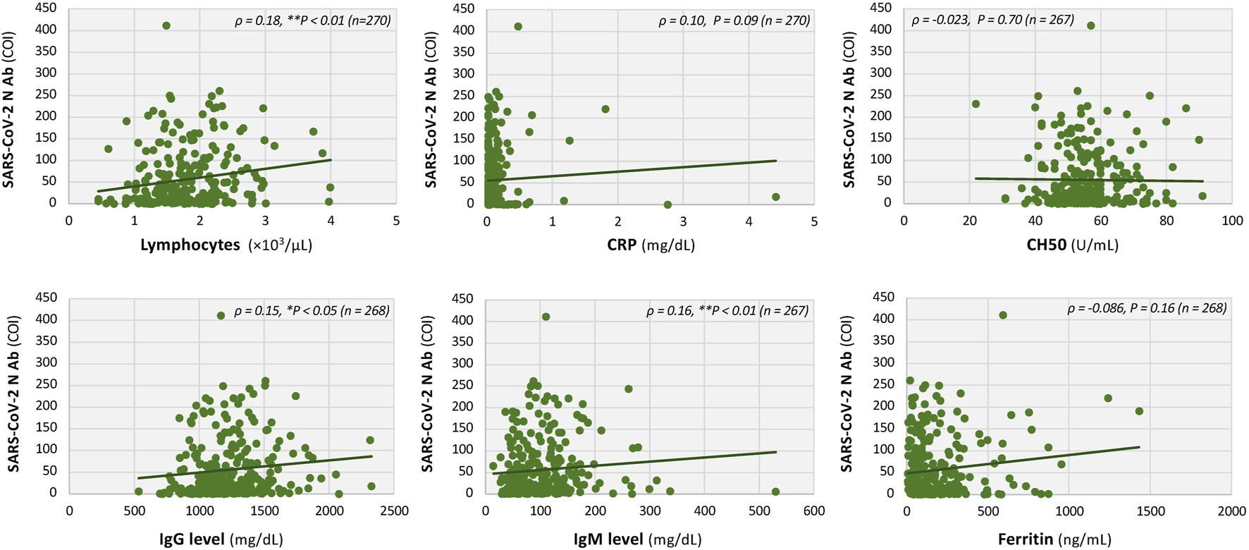 To investigate whether serum S- and N-antibody titers against SARS-CoV-2 spike and nucleocapsid proteins reflect the clinical features of LC.