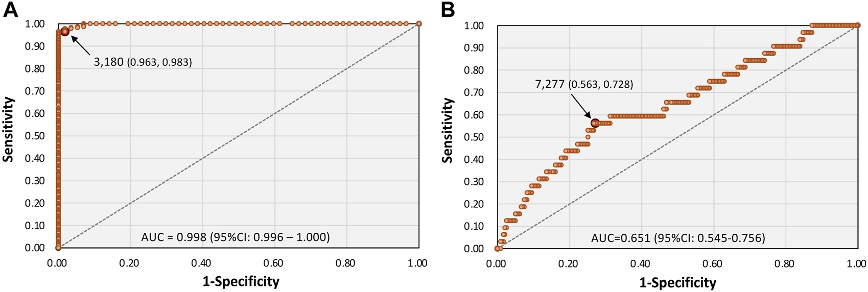 Receiver operating characteristic (ROC) curve analyses were performed to evaluate the discriminatory performance of serum SARS-CoV-2 S-antibody titers for vaccination status and the presence of memory disturbance. The area under the curve (AUC) with 95% confidence intervals (CIs) was calculated to assess discriminative ability. Optimal cutoff values were determined by maximizing the Youden index, which maximizes the sum of sensitivity and specificity.