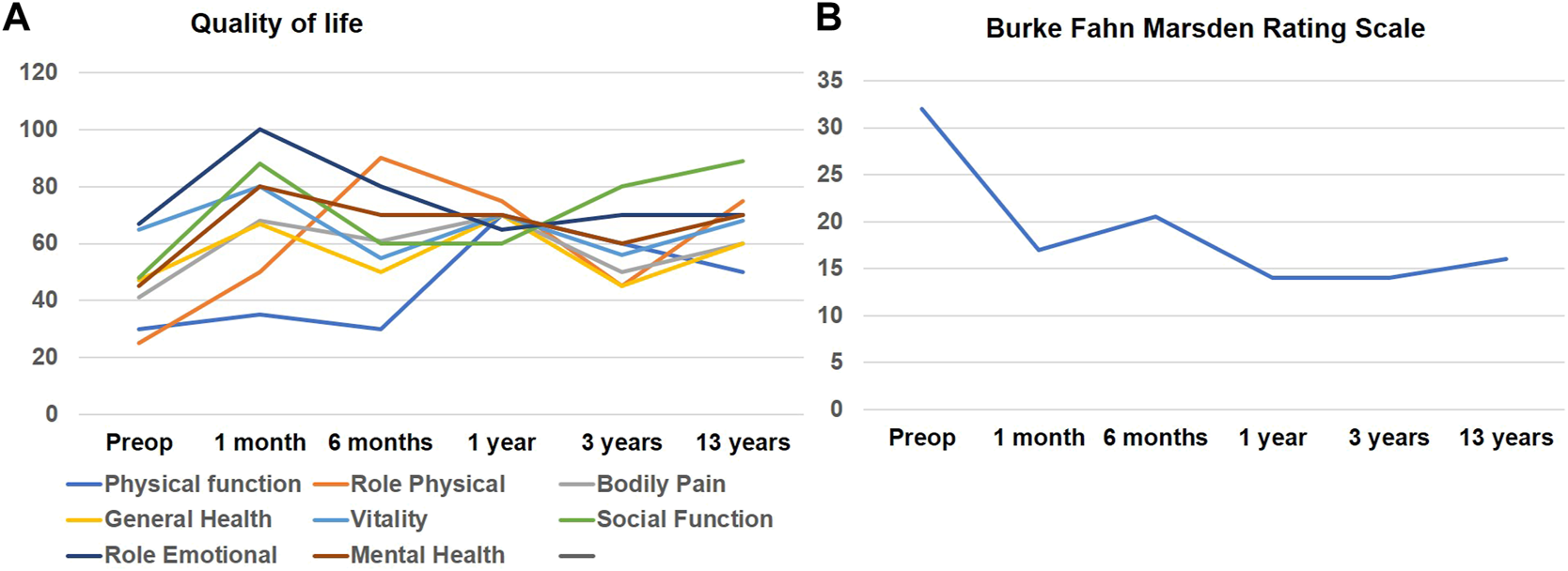 (A) illustrates line graphs of individual domain scores for SF-36 quality-of-life assessment that was recorded longitudinally after DBS surgery. Physical Function; Role physical and Social Function domains showed initial improvement which seemed to diminish over time however remained higher than scores before surgery. (B) illustrates the Burke-Fahn-Marsden dystonia rating scale assessed at multiple time intervals after DBS surgery.