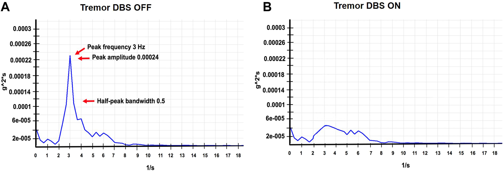 (A,B) represent accelerometer-based tremor recordings with DBS OFF, and DBS ON DBS (Left GPi, C+ 1-, 3V, 180 PW, 60 Hz; Right GPi, C+ 1-, 3V; 180 PW; 60 Hz), wash-out and wash-in intervals were 30 min respectively. These recordings were performed at the last follow-up visit. The figure illustrates the power spectrum analysis of the tremor signal. The raw signal was digitized, filtered (0–50 Hz) and was subjected to a fast fourier transform (FFT) analysis to generate the frequency peak. We first divided the selected data series (10 s) into overlapping sections of a specified window length, and window overlap and the squared FFT magnitude of each section was averaged and zero-padded to identify the dominant frequency peak. The tremor amplitude was calculated as a square root of the summated power of the frequency peaks recorded along the x, y, and z-axes. The width of the spectral peak at one-half the peak amplitude in the power spectrum was calculated to determine the cycle-to-cycle variability in the frequency (half peak bandwidth > 2 Hz indicates a more irregular tremor).