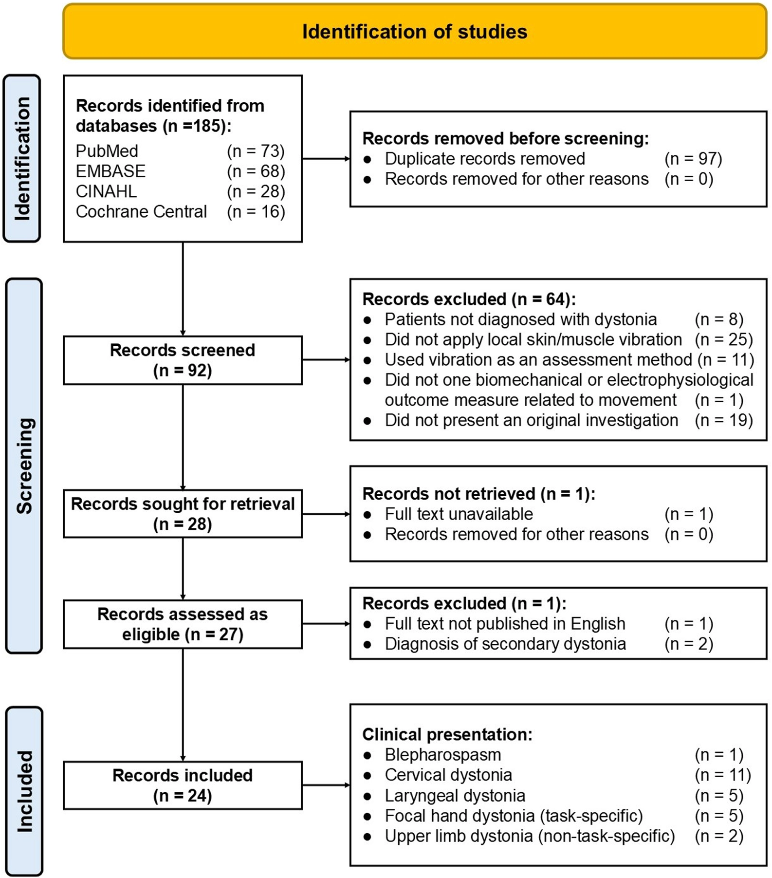 Inclusion criteria were: 1) Inclusion of participants who presented with a form of focal dystonia (FD), 2) application of superficial VTS adjacent or directly to dystonic muscles or regions, 3) reporting of at least one biomechanical and/or electrophysiological outcome measure reflecting possible VTS effects.