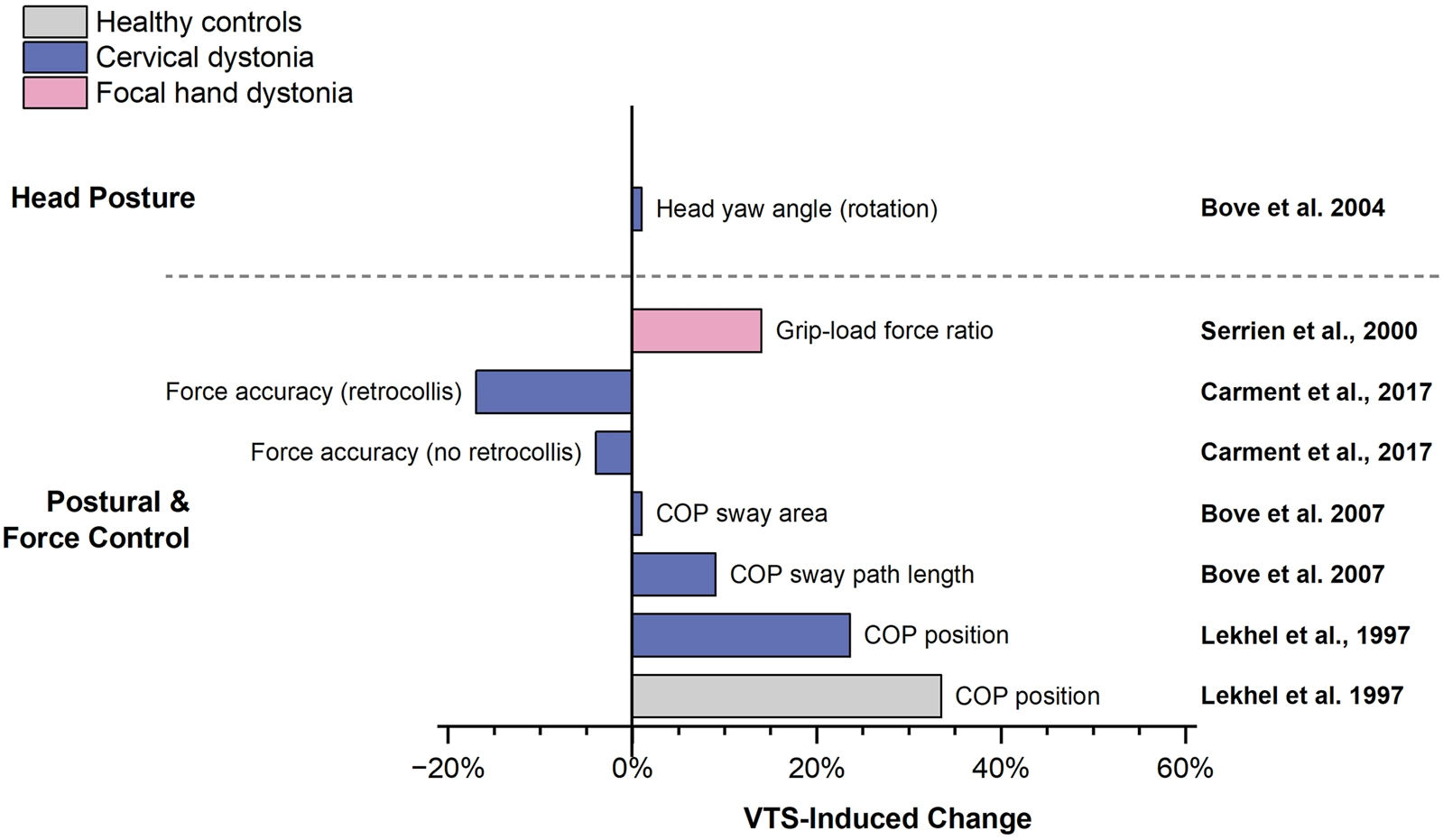 The usefulness of VTS has been recognized for treating abnormal muscle tone, balance and gait in neurological diseases such as stroke [36–38], cerebral palsy [39], Parkinson’s disease [40], and multiple sclerosis [41]. Given the overwhelming evidence that somatosensory processing is affected in focal dystonia [17], VTS may also be a useful non-invasive form of neuromodulation for treating symptoms associated with focal dystonia. This study systematically reviewed the current empirical evidence of this claim based on biomechanical, electrophysiological, and clinical outcomes measures to document possible therapeutic effects of VTS in patients with focal dystonia.