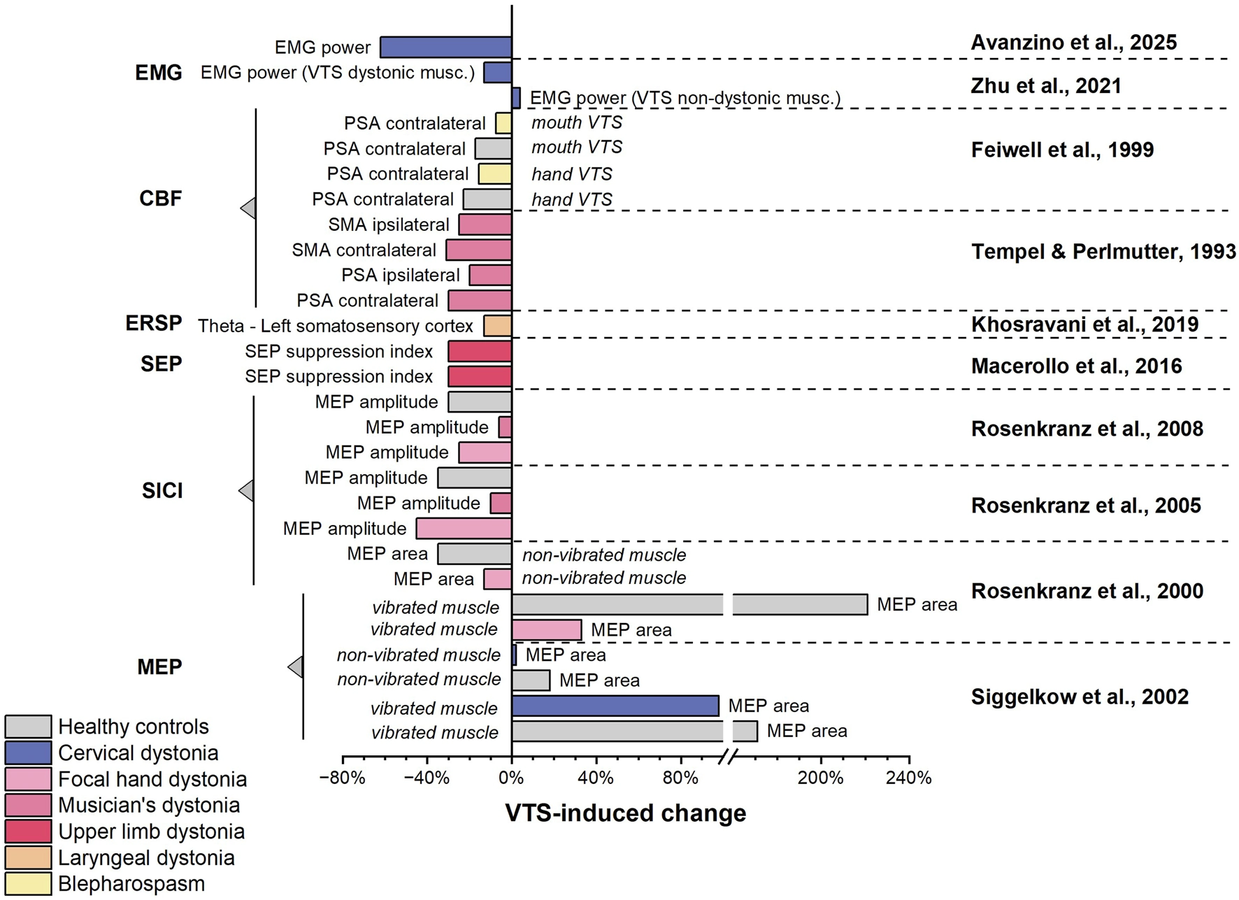 The review of empirical data indicated that VTS of dystonic regions is typically fast acting and can lead to symptoms reduction within minutes. Results show than VTS can 1) induce head righting and reduce pain in cervical dystonia, 2) improve voice quality and reduce speech effort in laryngeal dystonia, 3) normalize muscle activation in upper limb and cervical dystonia. Based on objective behavioral and biomechanical measures as well as subjective effect ratings by patients, between 57% and 85% of participants responded to VTS by reducing the frequency and magnitude of symptoms. Temporal post-treatment VTS effects varied widely, with short applications (4 s −15 min) decaying within minutes and longer applications (20–45 min) showing effects for hours or days. Major observable electrophysiological responses to VTS included 1) a reduction in EMG activity of vibrated muscle and its synergists, and increased activity of antagonistic muscles, 2) reduction of excessive neuronal synchronization over somatosensory-motor cortex, 3) and altered motor-evoked potentials of vibrated muscles, their synergists and antagonists.