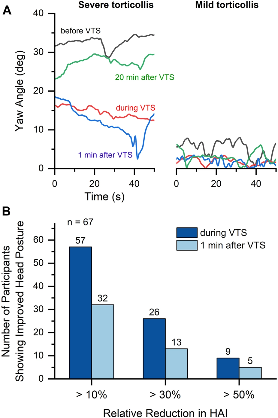 The most comprehensive and systematic evidence that cervical VTS can induce head righting in CD comes from a multi-center study that examined 67 CD patients [46]. Three-dimensional head angle kinematics and surface EMG for bilateral sternocleidomastoid and trapezius muscles were recorded while VTS was applied to these muscles under 9 different stimulation conditions (e.g., single muscle, bilateral trapezius). Nearly half of participants exhibited large changes in abnormal head posture as measured by a head angle index that expressed 3D head position relative to a normal upright head posture (see Figure 5A). Responsiveness to VTS was widespread with 85% of participants showing head righting responses (see Figure 5B).