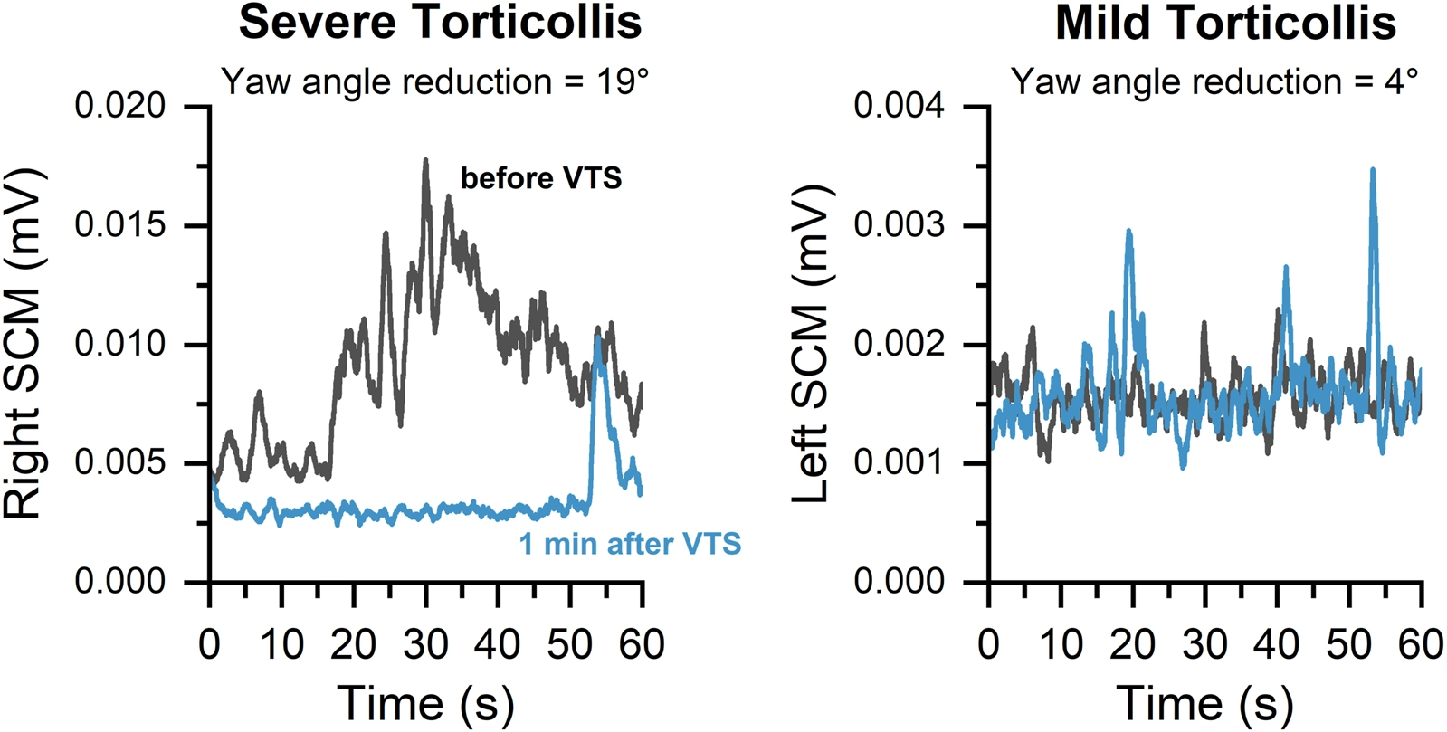 Several single case and quasi-experimental studies examined the effects of neck muscle vibration in patients with CD [46, 53, 56, 67, 68]. The case report by Karnath et al. documented that trapezius muscle vibration can induce head righting in a person with right torticollis [53] and, compared to baseline prior to VTS, the frequency of dystonic neck movements decreased by 60% post VTS in a juvenile patient with CD [68]. Short 5-s bursts of VTS led to fast changes in head position, but the head returned within seconds to the initial pathological position after each burst [56]. Applying VTS over longer time periods (15–45 min) could lead to prolonged normalization of head posture that would decay slowly within 20 min after VTS was turned off [46, 53, 68] (for a summary of the effects on head kinematics due to VTS, see Figure 4).