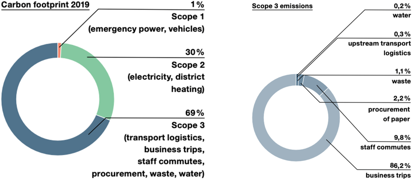 To be able to assess the significance of the decisions on balance limits for subsequent comparability, it is necessary to understand their definition. Defining the balance limits implies first determining which organisational units, e.g., an exhibition space or the lifecycle of a production, are included in the report and second identifying the direct and indirect emissions associated with this unit. This decision – to define the balance limits – is directly linked to results in the so-called three scopes. In a carbon footprint report, the emissions are categorised as scope 1, 2 and 3 emissions by the GHG protocols: Scope 1 includes direct GHG emissions from on-site fuel-burning processes, such as heating plants, vehicles, and refrigerant leaks. Scope 2 covers indirect emissions from electricity and district heating use, whereas scope 3 includes all other indirect emissions from upstream and downstream activities, mainly business trips, commuting, and goods transport, often the largest share in non-production facilities; scope 3 is again divided into obligatory (e.g., staff commutes, business trips or waste) and optional emissions (e.g., visitor mobility) (German Federal Cultural Foundation (GFCF), 2021, 10, 18). Due to their tendentially higher proportion, the emissions in scope 3 are of particular importance when it comes to the question of which measures achieve an ecological impact. One example from each of the different domains will illustrate the relation between defining the balance limits and the results in the three scopes: Stadtbücherei Norderstedt, a municipal library, e.g., “excluded the media and its transport to the libraries, staff commutes and the emissions generated by the users in the libraries“, a decision that led to scope 3 emissions of 46%, a relatively low result (German Federal Cultural Foundation (GFCF), 2021, 53). Museum Folkwang, in turn, focused “on facility management and selected museum operational processes” while excluding “emissions from gastronomy and visitor travel,” a decision that explains why emissions in scope 1 reached 94% whereas in scope 2 emissions reached only 2% and in scope 3 only 4% which severely limits comparability to other museums (German Federal Cultural Foundation (GFCF), 2021, 39). And Schaubühne am Lehniner Platz, one of the major ensemble and repertory theatre in Berlin, excluded its external locations, but collected data on mobility which highly contribute to emissions in scope 3 so that the results for scope 3 achieved a high reliability (German Federal Cultural Foundation (GFCF), 2021, 43). The report visualised the results for each organisation as shown in Figure 1 for Schaubühne am Lehniner Platz.