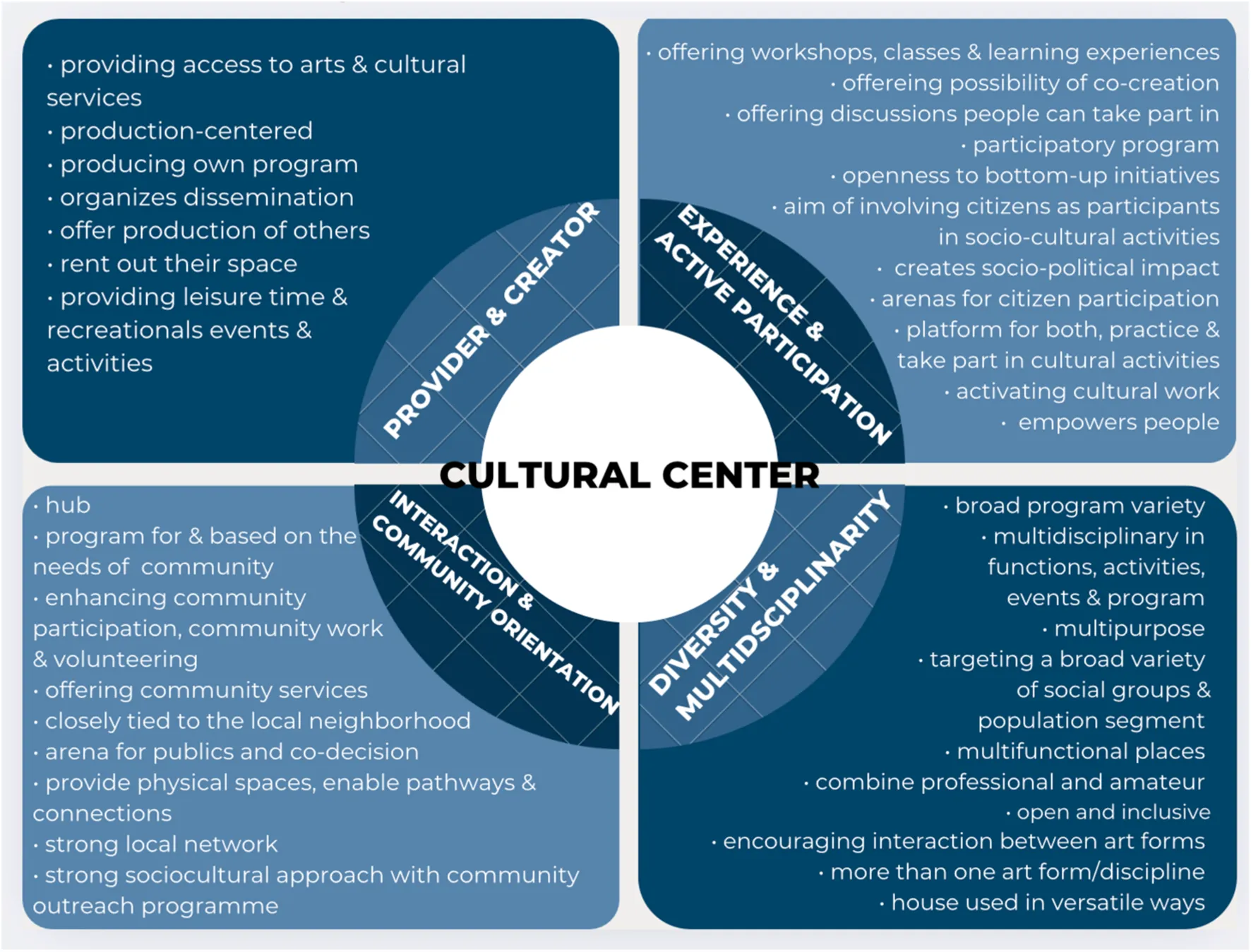 One of the few exceptions are the so-called socio-cultural centers, whose essence (e.g., Dallmann, 2015; Kegler, 2020; Kegler, 2023) has been expanded upon by researchers, especially in Germany, with a 50-year tradition of socioculture (Sievers, 2023). Beyond this, the available research rarely prioritizes conceptual clarity, particularly regarding the term ‘cultural center’. As a result, ‘cultural center’ and ‘socio-cultural center’ are often used interchangeably (e.g., Eriksson et al., 2017; Ranczakowska et al., 2024). However unlike more clearly defined cultural organizations such as museums, libraries, theaters, concert halls, and galleries, where specific activities and functions are readily identifiable, cultural centers encompass a broad and varied range of activities. This diversity makes it a dynamic concept, which resists confinement to a single, enduring definition (Kegler, 2020: 29) and thus aggravating classifying and developing a typology for cultural centers (Pfeifere, 2022: 29). Recent attempts of clarification have been made by Stenlund (2010), Ruusuvirta and Pasi (2014), Dapkus and Dapkutė (2013), Eriksson et al. (2017), Bogen (2018), Järvinen (2019); Järvinen (2021a), Pfeifere (2022), as well as ENCC (2023), presenting a wide range from short and functional definitions to the attempt of presenting a lengthy one-fits-all-definition. This research stands on these shoulders as it delivers a new and unique typology that differentiates between the various facilities operating under the label ‘cultural center.’ This refined classification provides a structured framework for distinguishing cultural facilities, addressing the conceptual ambiguities that have hindered previous research. By offering a more precise categorization, this typology enables cultural policymakers, researchers, and practitioners to better understand, support, and develop cultural centers. Moreover, it facilitates more targeted policy interventions and funding decisions that recognize the distinct roles and contributions of different types of cultural centers to their municipalities.