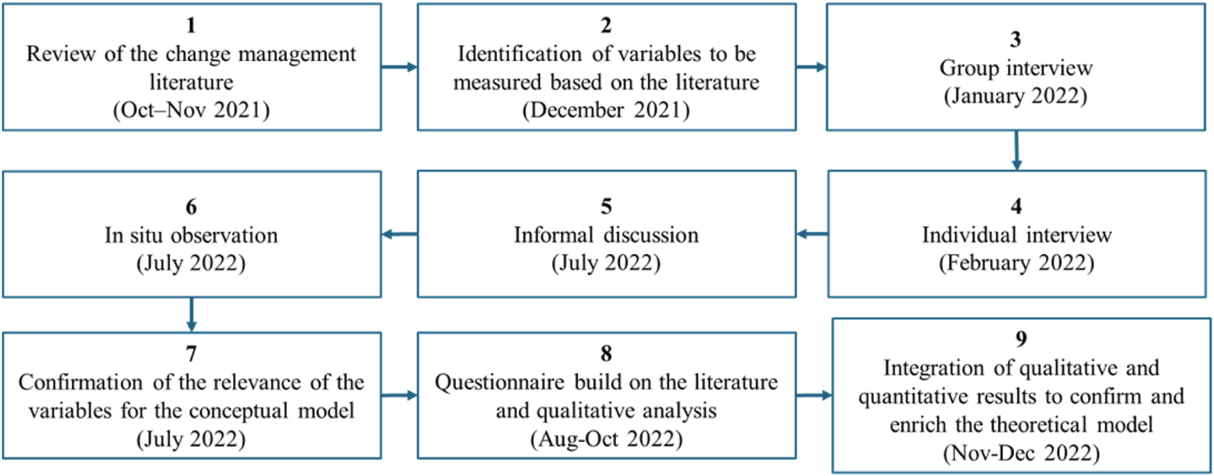 The exploratory nature of the study in the case of art and culture required the use of a range of qualitative and quantitative methods (Shah and Corley, 2006). Employing a range of different methodological approaches is one of the most effective ways of ensuring the success of a change initiative (Oreg et al., 2011). More specifically, we used the change management literature and a conceptual framework designed for traditional organizations that we then exported and adapted to the cultural and artistic environment, which required conducting individual and group interviews before distributing a questionnaire. Primary data collection took place between January 2022 and October 20222. Two methodologies (qualitative and quantitative) were used complementarily, with each serving a different purpose (see Shah and Corley, 2006). The qualitative data helped confirm the choice of variables to be measured to ensure they were grounded in the regional cultural reality. The quantitative data provided a basis for analyzing the cause-and-effect relationships of the theoretical model. Finally, Figure 2 illustrates the sequence of the research process, combining secondary data collection (literature review) with primary data collection (qualitative and quantitative). This mixed-method design reflects a triangulation approach whereby qualitative and quantitative data were mobilized to capture complementary perspectives on the phenomenon (Denzin, 2017; Greene, 2007).