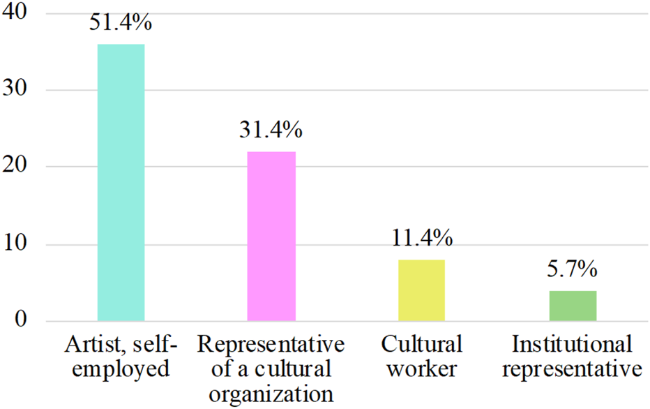 Figure 3 shows the distribution of respondents. Artists and self-employed workers account for the bulk of the respondents (51.4%), followed by representatives of cultural organizations (31.5%), cultural workers (11.4%) and institutional representatives (5.7%).