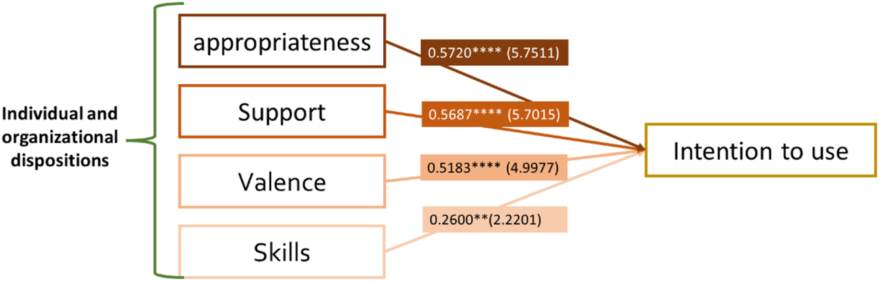 Individual dispositions (skills, valence, appropriateness) and organizational dispositions (support) positively influence change (defined as intention to use the digital platform)