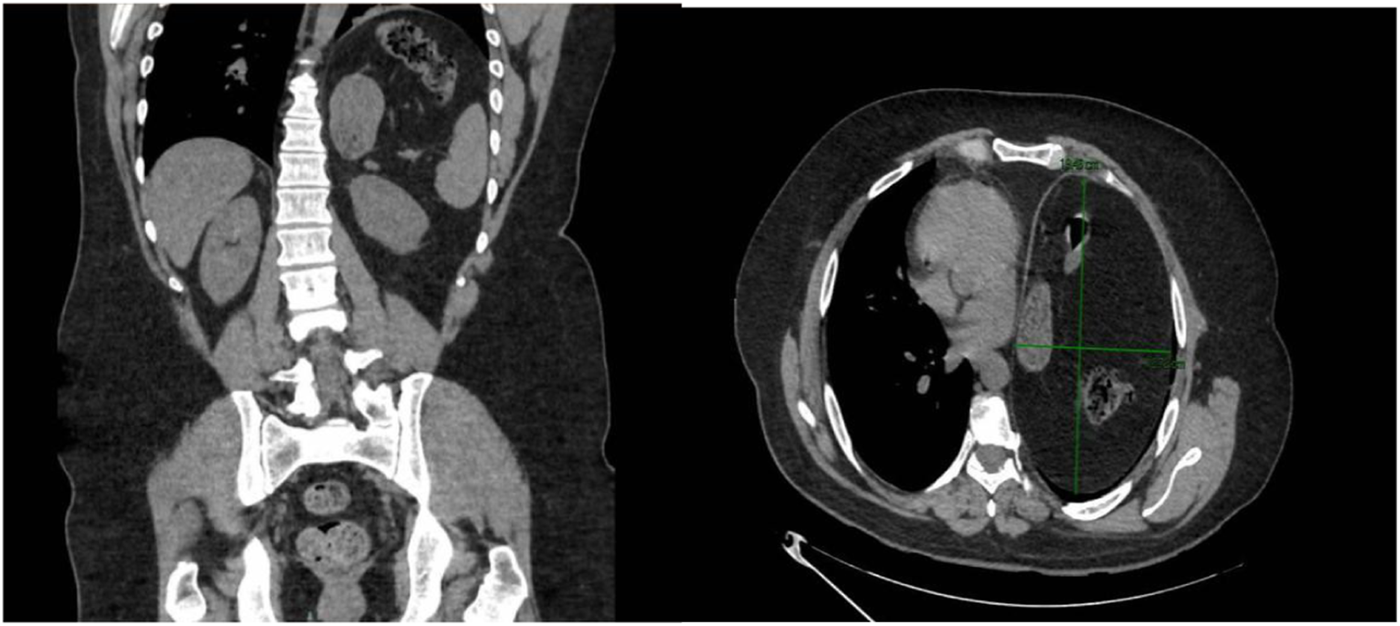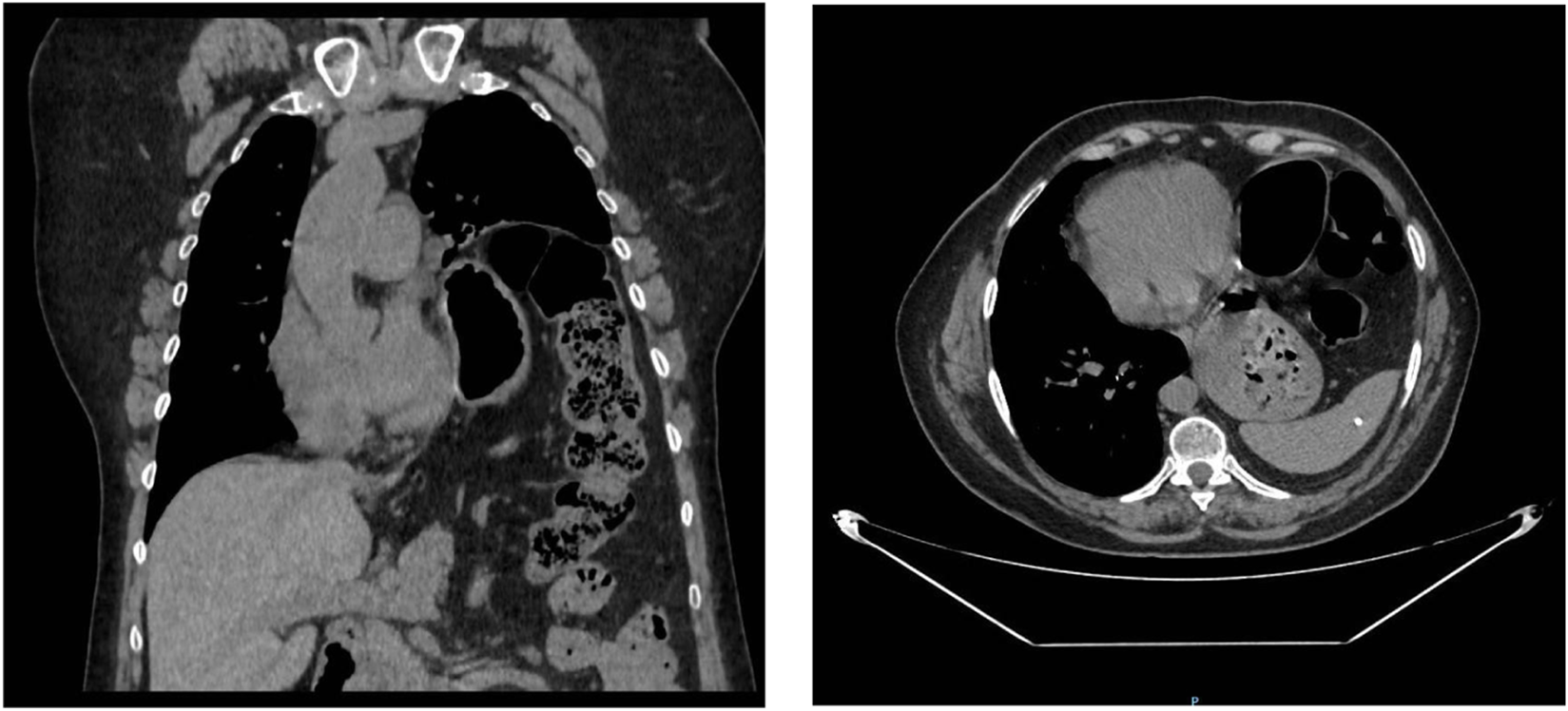 Computed tomography (coronal and transverse section) marked elevation of the left hemidiaphragm and herniation of abdominal contents into the thoracic cavity, including the stomach, spleen, and splenic flexure of the colon with a moderate contralateral mediastinal shift.