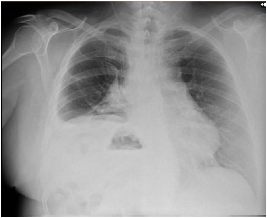 A 63-year-old woman (body mass index 35 kg/m2) was evaluated for dyspnoea and digestive symptoms of 2 years’ duration. After being evaluated by the pulmonology department, idiopathic left diaphragmatic relaxation was diagnosed, and the patient was referred for thoracic surgery. Her medical history included being a former smoker for 20 years, and she was diagnosed with severe OSAHS (obstructive sleep apnoea-hypopnea syndrome). The physical examination was normal.