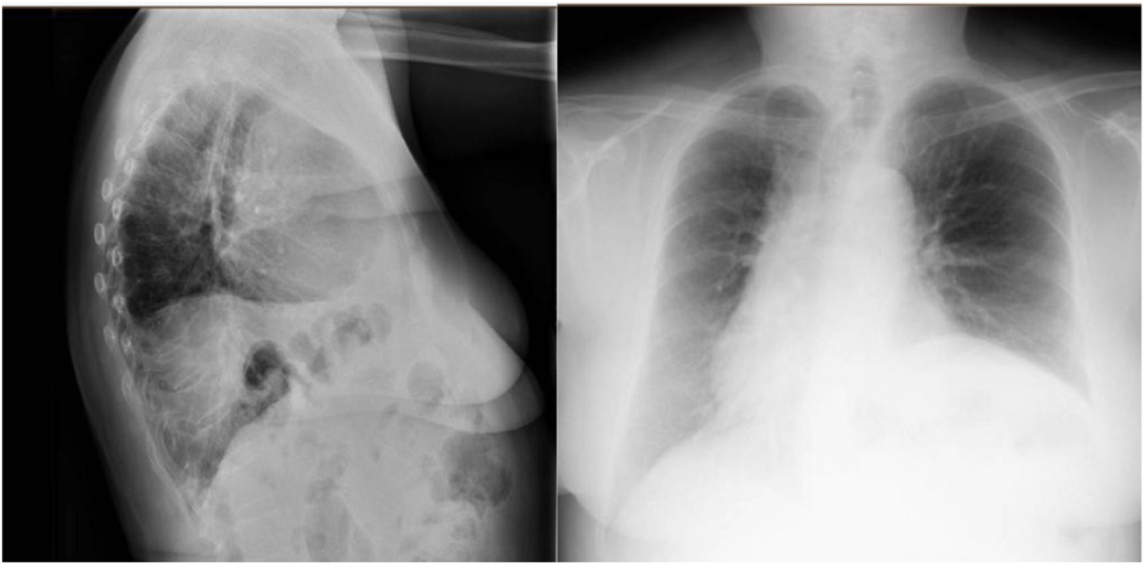 At a six-month follow-up, the patient reported a significant improvement in her quality of life, with improved respiratory function and digestive symptoms. At 12 months, the patient remained asymptomatic and without recurrence. The follow-up postoperative X-ray showing decreased—but not complete resolution of—left hemidiaphragm elevation compared to the preoperative state, which did not show an elevated diaphragm (Figure 4).