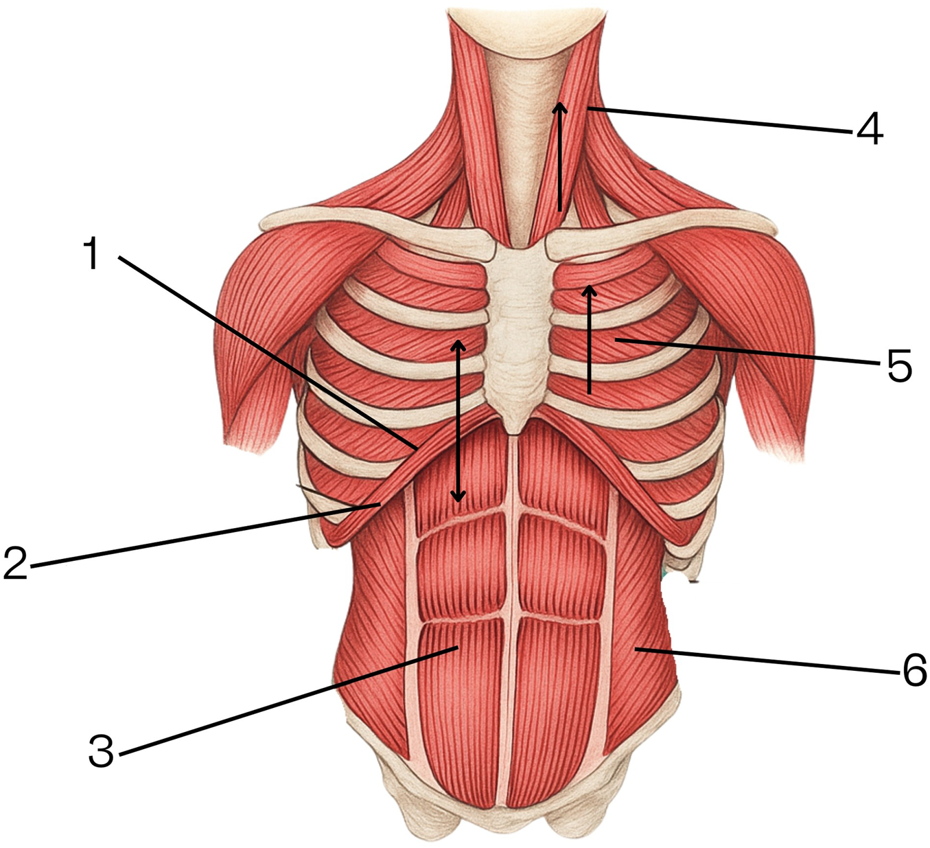Mechanism of inspiration. 1. Position of the diaphragm at the beginning of inspiration. 2. Position of the diaphragm at the end of inspiration. 3. Rectus abdominis muscles. 4. Sternocleidomastoid muscle. 5. Intercostal muscles (anterior and posterior). 6. Lateral abdominal wall muscles (transversus abdominis, internal oblique, external oblique).