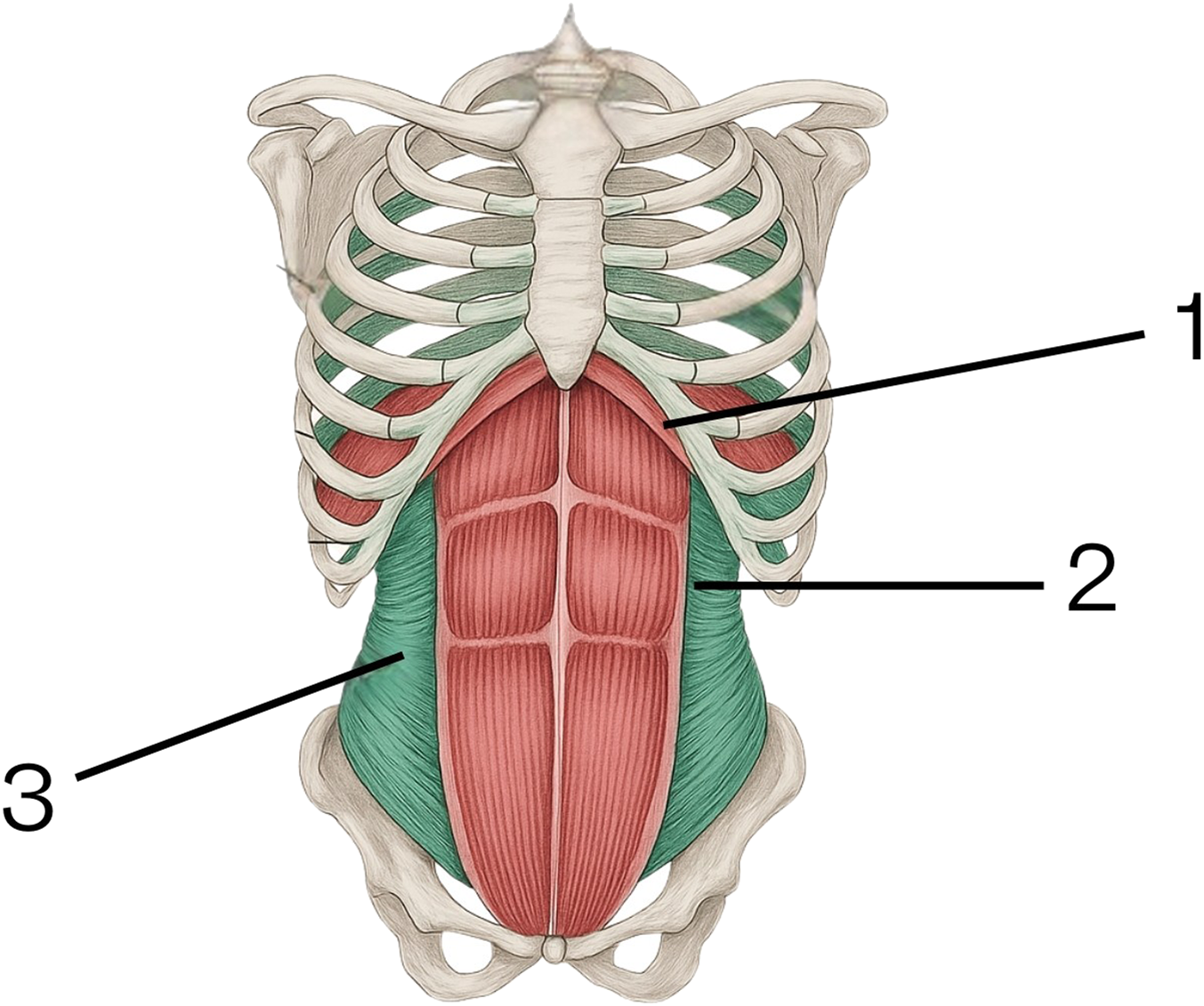 Mechanism of expiration. 1. Diaphragm. 2. Rectus abdominis muscles. 3. Lateral abdominal muscle group.