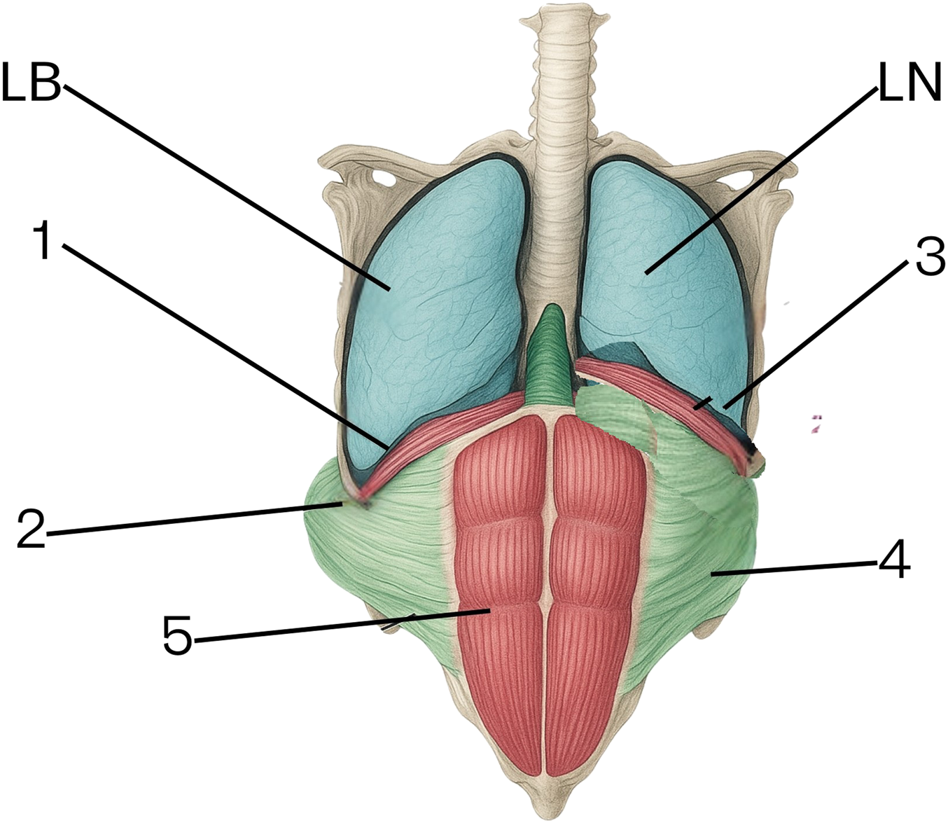 Diagram of Diaphragm Positioning and Abdominal Mechanics Post-BTA Injection. 1. Diaphragm position at the end of expiration following botulinum toxin administration. 2. Passive stretching of the lateral abdominal wall creating more space for the abdominal viscera. 3. Diaphragm position at the end of inspiration under natural (non-BTA) conditions. 4. Lateral abdominal muscle position at the end of inspiration under natural (non-BTA) conditions. 5. Rectus abdominis muscles (function preserved in both conditions). 6. LB – representation of lung volume at the end of expiration post-BTA. 7. LN – representation of lung volume at the end of expiration without BTA.