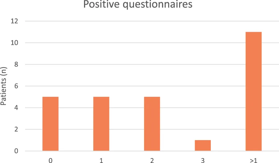 The results of the psychological assessments are summarized in Table 2. Of the 16 patients who completed the full psychological screening, eleven (69%) screened positive on at least one of the questionnaires. The HADS revealed a median anxiety score of 3.5 (IQR 0–7.5) and a median depression score of 3.5 (IQR 2–6.5). The Mastery questionnaire indicated reduced self-efficacy in 50% of patients, with a median score of 19.5 (IQR 15–25). PCL-5 screening suggested PTSD-consistent symptoms in 12.5% (median 9, IQR 2–15). Preoperative QoL was scored at a median score of 47 (IQR 38–53). Furthermore, 6 patients (38%) screened positive for more than one psychological comorbidity (Table 3).
