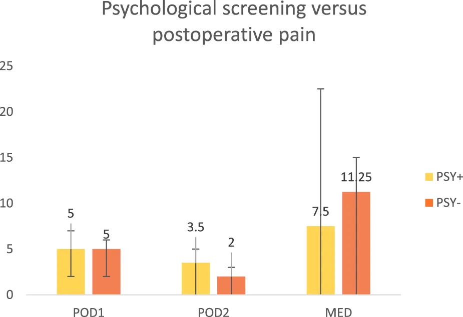 Due to the limited expected sample size, statistical analysis primarily focused on descriptive statistics and effect sizes. This approach aimed to provide preliminary insights into the relationships between psychological factors and postoperative outcomes. Sample size was set at 35 patients, based on the expected number of eligible cases presenting at the outpatient clinic over the inclusion period. Descriptive outcomes are reported using median and interquartile range (IQR), as the data were not assumed to be normally distributed. IQR was preferred over standard deviation or range to provide a more robust summary of central tendency and variability, especially for ordinal data. Primary outcomes included questionnaire completion rates and scores. Secondary analyses explored associations between psychological conditions and postoperative outcomes and pre- to postoperative QoL changes. Given the pilot nature of this study, these outcomes are presented descriptively and no formal comparative analysis was performed.