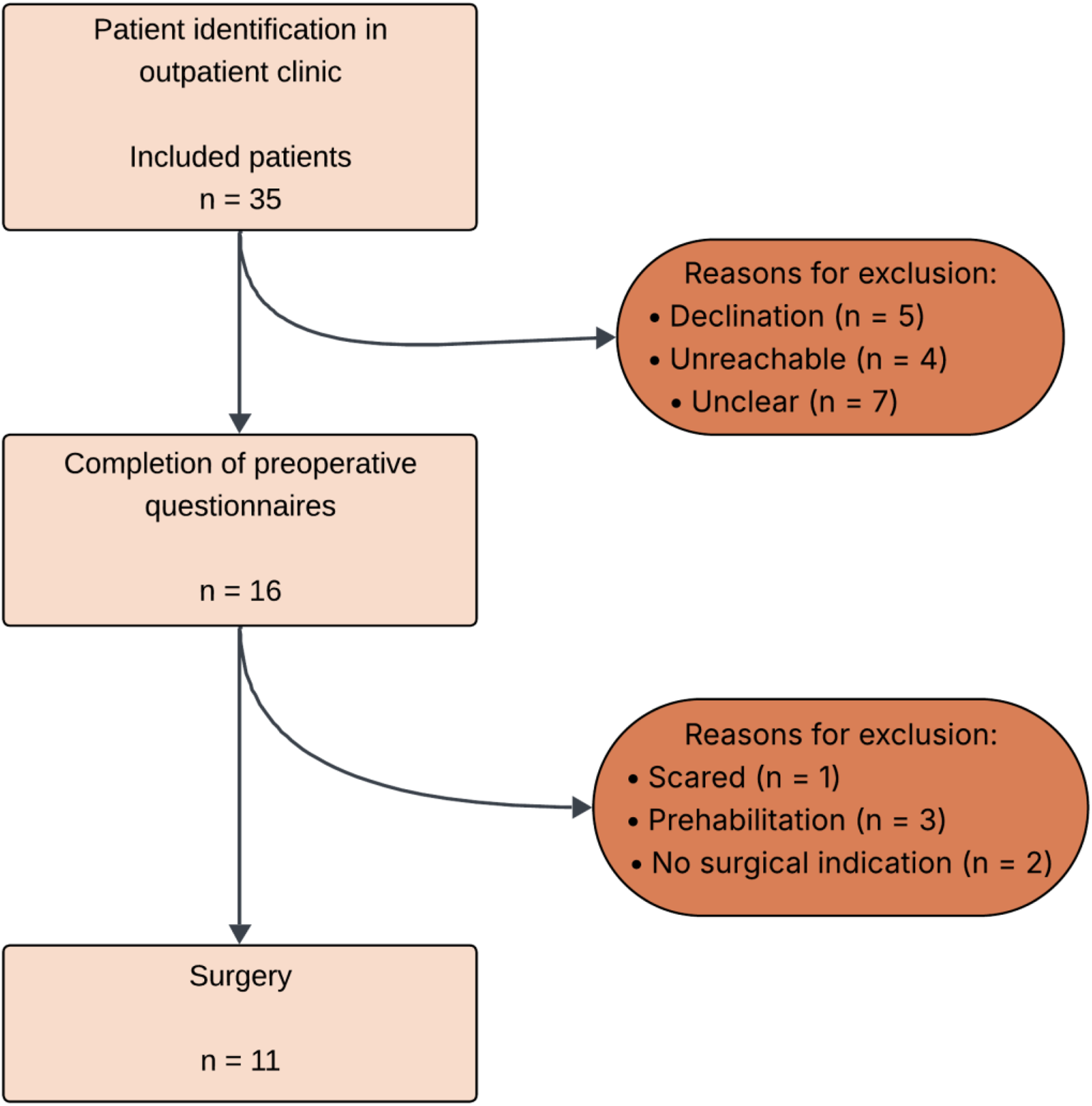 A total of 35 patients were included in the study. All patients provided informed consent to participate with this study. Sixteen patients (46%) completed the full set of the three additional preoperative psychological questionnaires, despite three or more attempts to contact eligible patients again. Five patients explicitly declined participation. Seven patients failed to return questionnaires for unclear reasons despite initial informed consent. The remaining four patients could not be reached (Figure 1).