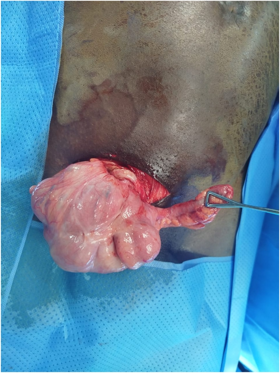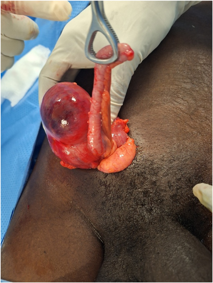 This is a 44-year-old male patient, a truck driver, who had had a right inguinal hernia for 2 years. He was admitted 3 days following the first patient. He came to the clinic for a right inguinal-scrotal swelling that had become painful and irreducible 11 h before the consultation, without vomiting or associated transit disorders. On physical examination, the abdomen was soft. The rectal ampulla contained faecal matter on examination. A strangulated right inguinal-scrotal hernia was diagnosed. Laboratory tests showed white blood cells at 5,200 and neutrophils at 78.6%. Urea, creatinine and electrolytes were normal. He underwent surgery via a transverse right inguinal incision under general anaesthesia. After opening the hernia sac, we discovered an inflamed appendix and a viable caecum. Figure 2. The patient was classified as type 2 according to the Losanoff-Basson classification. We protected the surgical site with povidone-iodine-coated compresses and performed an antegrade appendectomy. We pushed back the caecum before closing the hernia sac. A Lichtenstein repair was performed with a polypropylene prosthesis. The prosthesis site was irrigated with povidone-iodine before closure before closure to reduce risk of infection. The postoperative course was uneventful. The patient was discharged 24 h after surgery. The patient received antibiotics based on amoxicillin and clavulanic acid (80 mg/kg/day), paracetamol (15 mg/kg/6 h) and nefopam (20 mg/8 h) in accordance with our local prescription protocol. Follow-up on day 7 and day 30 after surgery was normal. Pathological examination of the surgical specimen confirmed acute appendicitis. The patient will be monitored during consultations if required.