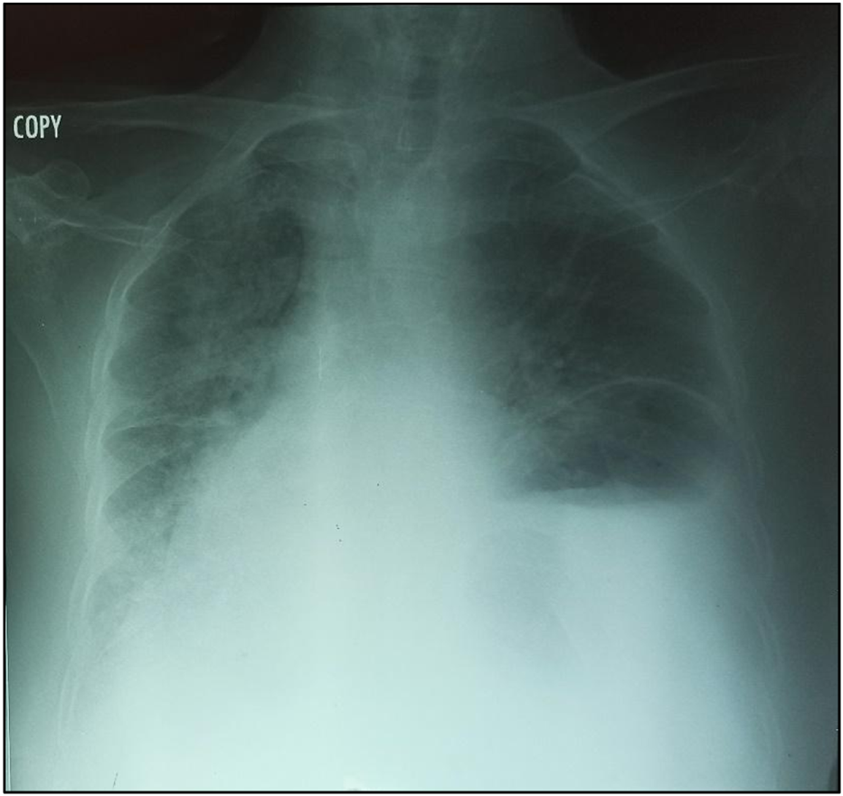 Chest radiography showing enlargement of the mediastinum and the gastric pocket in the left chest.