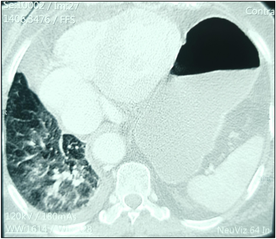Chest computed tomography showing the spleen and stomach in the left thoracic cavity and condensation of the right lung associated with the mid-pleura.