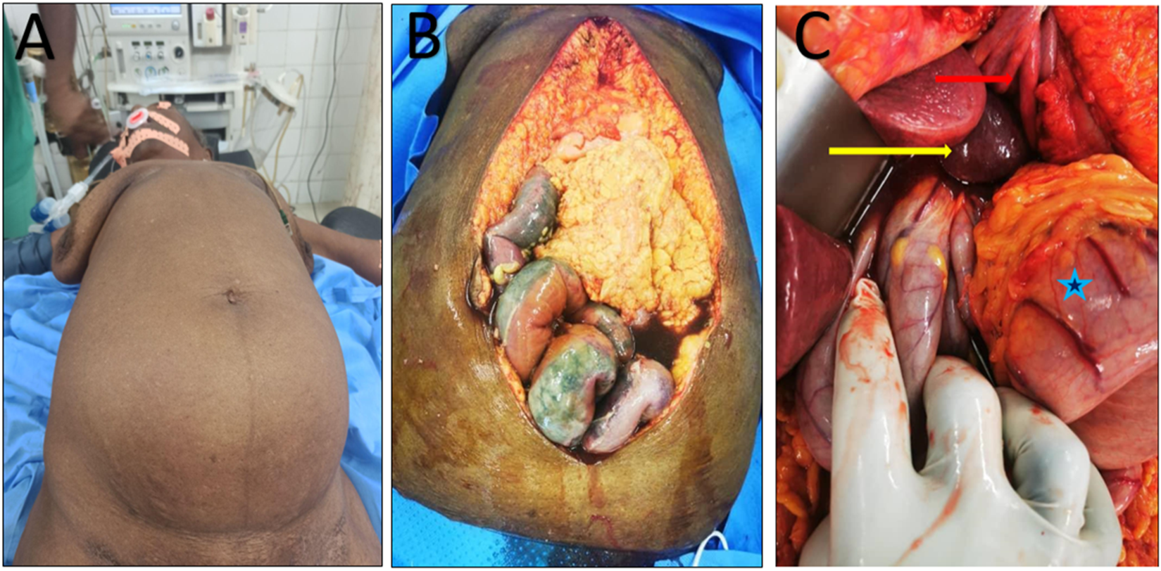 (A) Distended abdomen; (B) Necrotic ileum; (C) Stomach (blue star) and spleen (yellow arrow) in the left diaphragmatic defect (red arrow).