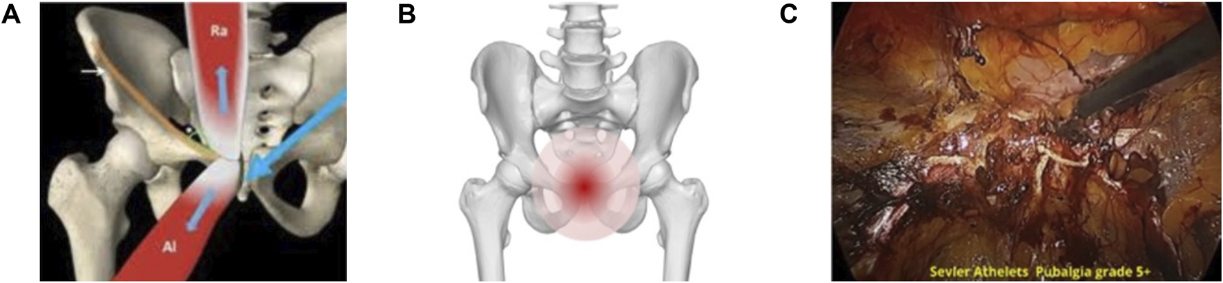 Asymmetric load transfer to pubic symphysis and related bone stress injury in severe AP grade 4–5 (A) The biomechanical imbalance between the rectus abdominis and the adductor longus muscles; causing asymmetric force transmission through the pubic symphysis. Adapted from Corazza; et al. [24]; Athletic pubalgia: a detailed didactic approach; ECR 2015; Poster C-2375. Licensed under an open license. (B) An anatomical visualization of the pubic bone; emphasizing the stress-prone pain region in cases of severe AP. Adapted from DBCLS (2015); Wikimedia Commons; licensed under CC BY-SA 2.1 JP. Modifications were made. (C) An endoscopic intraoperative view of a high-grade AP case; highlighting severe tissue damage with neovascularization and wiled nerves developed with pubic symphysis pathology and disc posterior herniation region.