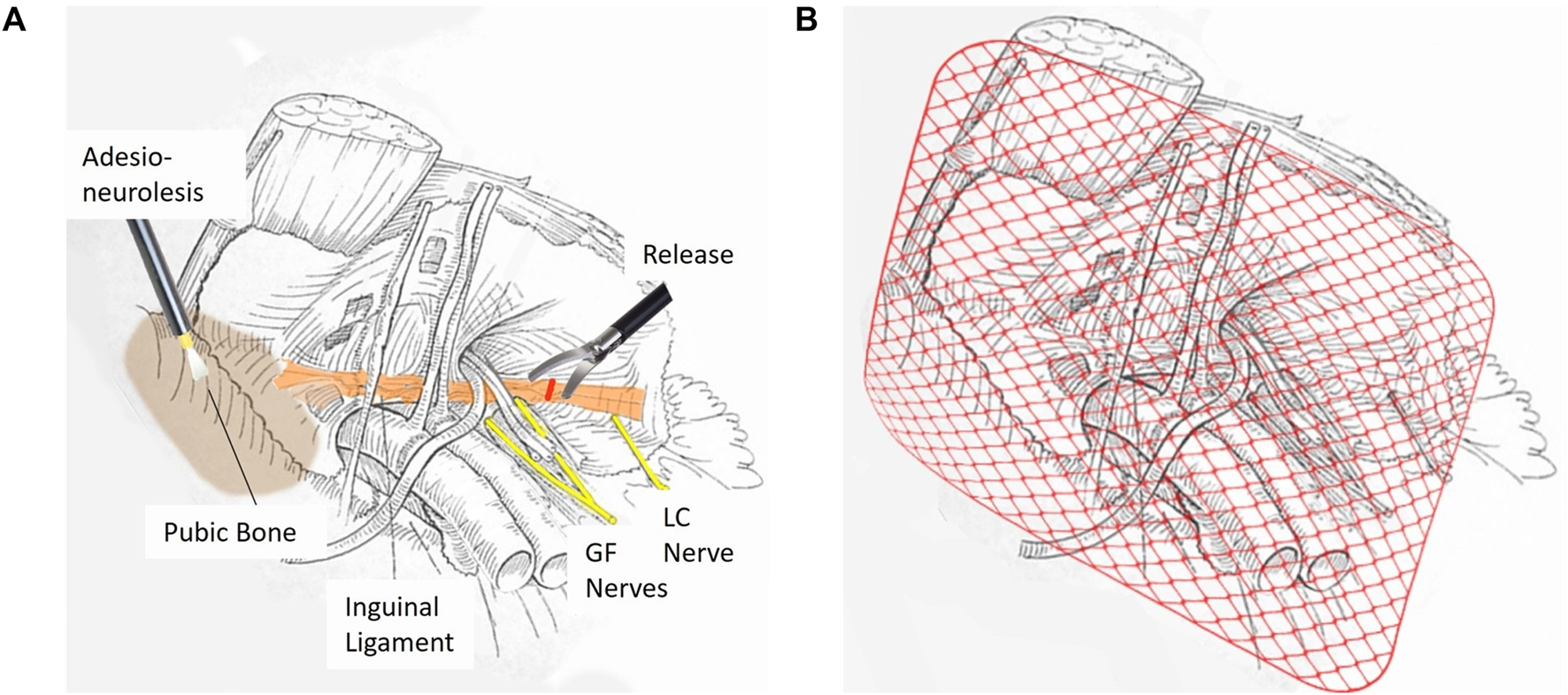 Dudai has described the development and refinement of TEP-RRT—a bilateral endoscopic approach that builds upon the TEP framework and has evolved over three decades of clinical practice. It directly targets the dual pathophysiology of SH/AP: biomechanical instability and chronic nerve entrapment [70–72]. The procedure is divided into two distinct phases: release and reinforce (1) Release–Adhesiolysis and excision of scar tissue and lipomas, debridement of the pubic symphysis and bone, and inguinal ligament division to decompress the tree entrapped nerves below (Figure 3A). (2) Reinforce–PW and pubic bone by placement of a 13 × 16 cm midweight mesh using biological glue (no sutures or staples) to avoid nerve irritation and enhance stability (Figure 3B) [70–72].