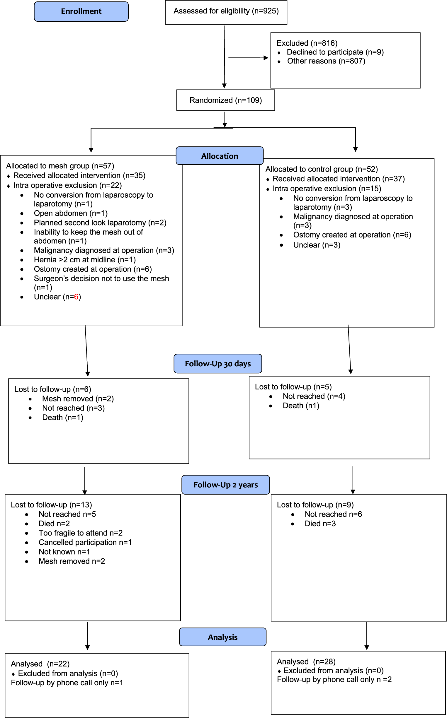 The sample size calculation was based on an expected incisional hernia rate of 10% in the mesh group and 25% in the control group, as suggested by earlier studies [1–4]. Using a significance level (α) of 0.05 and a power of 80%, a minimum of 97 patients per group was required. With an anticipated dropout rate of 20%, the final target was 122 patients per group. The sample size calculation pertained only to the primary outcome, while the secondary outcomes were interpreted as hypothesis-generating.