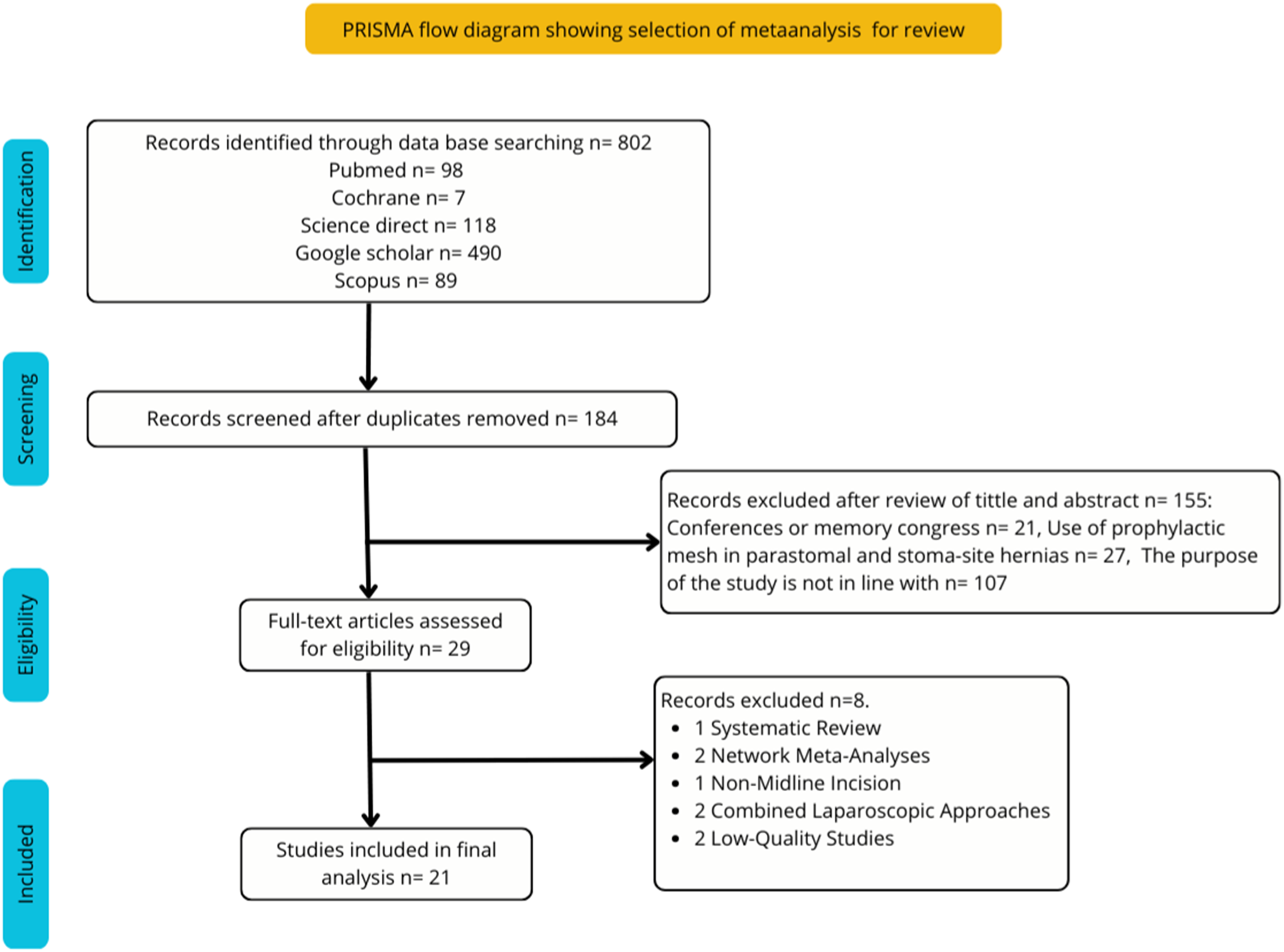 After searching the different databases, a total of 802 records related to the topic were identified. Following the removal of 618 duplicate articles, 184 records remained for screening. After title and abstract review, 155 articles were excluded for not meeting the inclusion criteria. Consequently, 29 full-text articles were assessed for eligibility. Of these, 8 meta-analyses were excluded after full-text evaluation due to methodological or conceptual reasons, including low methodological quality according to AMSTAR-2 [2], network meta-analysis design [2], non-midline incisions [1], or combined laparoscopic approaches [2]. Finally, 21 meta-analyses were included in the umbrella meta-analysis [1–3, 5, 18–34]. The detailed study selection process and reasons for exclusion are presented in Figure 1.